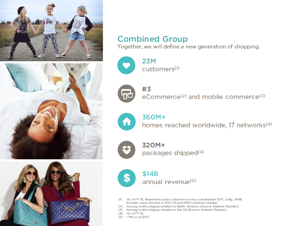 This communication includes certain forward-looking statements within the meaning of Section 27A of the Securities Act of 1933 and Section 21E of the Securities Exchange Act of 1934. Words such as “may,” “will,” “could,” “anticipate,” “estimate,” “expect,” “predict,” “project,” “future,” “potential,” “intend,” “plan,” “assume,” “believe,” “forecast,” “look,” “build,” “focus,” “create,” “work” “continue” or the negative of such terms or other variations thereof and words and terms of similar substance used in connection with any discussion of future plans, actions, or events identify forward-looking statements. These forward-looking statements include, but are not limited to, statements about the proposed acquisition (the “proposed acquisition”) of HSN, Inc. (“HSNi”) by Liberty Interactive Corporation (“Liberty Interactive”), the realization of estimated synergies and benefits from the proposed acquisition, business strategies, market potential, future financial prospects, new service and product offerings, and other matters that are not historical facts. These forward-looking statements involve many risks and uncertainties that could cause actual results to differ materially from those expressed or implied by such statements, including, without limitation, the expected timing and likelihood of completion of the proposed acquisition, including the timing and satisfaction of conditions to the proposed acquisition that could reduce anticipated benefits or cause the parties to abandon the transaction, the ability to successfully integrate the businesses, risks related to disruption of management time from ongoing business operations due to the proposed transaction, the risk that any announcements relating to the proposed transaction could have adverse effects on the market price of the common stock of HSNi or Liberty Interactive, the risk that the proposed transaction and its announcement could have an adverse effect on the ability of HSNi and Liberty Interactive to retain customers and retain and hire key personnel and maintain relationships with their suppliers and customers and on their operating results and businesses generally, market conditions conducive to stock repurchases, the risk of the amount of any future dividend HSNi may pay, and other factors. These forward-looking statements speak only as of the date of this communication, and Liberty Interactive, QVC, Inc. (“QVC”) and HSNi expressly disclaim any obligation or undertaking to disseminate any updates or revisions to any forward-looking statement contained herein to reflect any change in Liberty Interactive’s, QVC’s or HSNi’s expectations with regard thereto or any change in events, conditions or circumstances on which any such statement is based. Please refer to the publicly filed documents of Liberty Interactive, QVC and HSNi, including the most recent Forms 10-K and 10-Q for additional information about Liberty Interactive, QVC and HSNi and about the risks and uncertainties related to the business of each of Liberty Interactive, QVC and HSNi which may affect the statements made in this presentation.