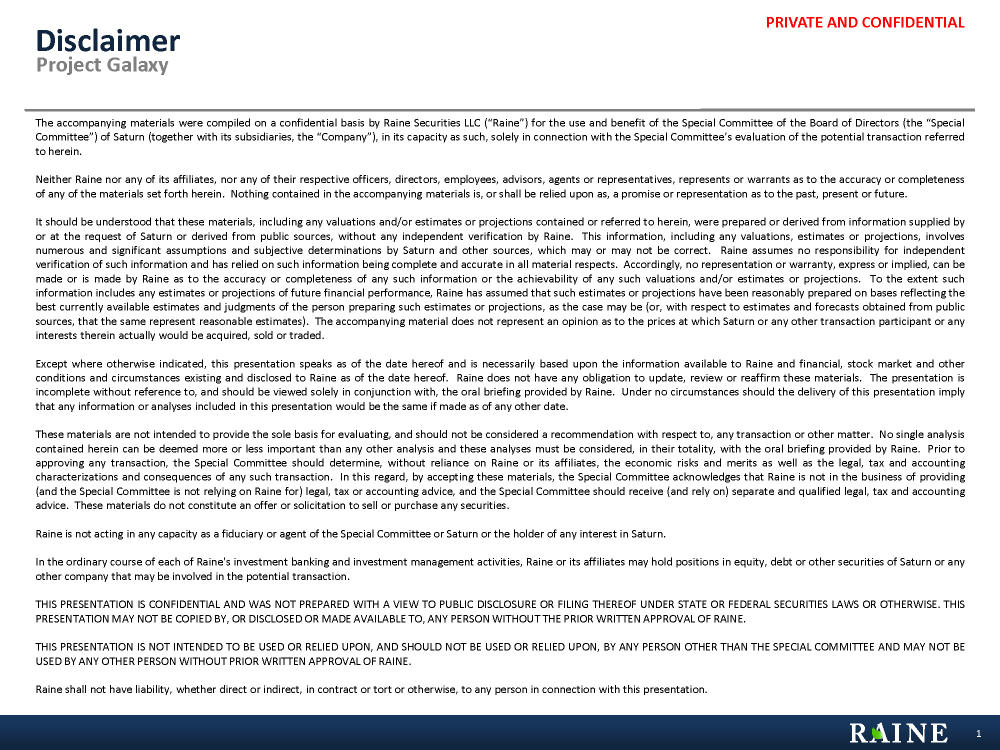 Disclaimer Project Galaxy PRIVATE AND CONFIDENTIAL The accompanying materials were compiled on a confidential basis by Raine Securities LLC (“Raine”) for the use and benefit of the Special Committee of the Board of Directors (the “Special Committee”) of Saturn (together with its subsidiaries, the “Company”), in its capacity as such, solely in connection with the Special Committee’s evaluation of the potential transaction referred to herein. Neither Raine nor any of its affiliates, nor any of their respective officers, directors, employees, advisors, agents or representatives, represents or warrants as to the accuracy or completeness of any of the materials set forth herein. Nothing contained in the accompanying materials is, or shall be relied upon as, a promise or representation as to the past, present or future. It should be understood that these materials, including any valuations and/or estimates or projections contained or referred to herein, were prepared or derived from information supplied by or at the request of Saturn or derived from public sources, without any independent verification by Raine. This information, including any valuations, estimates or projections, involves numerous and significant assumptions and subjective determinations by Saturn and other sources, which may or may not be correct. Raine assumes no responsibility for independent verification of such information and has relied on such information being complete and accurate in all material respects. Accordingly, no representation or warranty, express or implied, can be made or is made by Raine as to the accuracy or completeness of any such information or the achievability of any such valuations and/or estimates or projections. To the extent such information includes any estimates or projections of future financial performance, Raine has assumed that such estimates or projections have been reasonably prepared on bases reflecting the best currently available estimates and judgments of the person preparing such estimates or projections, as the case may be (or, with respect to estimates and forecasts obtained from public sources, that the same represent reasonable estimates). The accompanying material does not represent an opinion as to the prices at which Saturn or any other transaction participant or any interests therein actually would be acquired, sold or traded. Except where otherwise indicated, this presentation speaks as of the date hereof and is necessarily based upon the information available to Raine and financial, stock market and other conditions and circumstances existing and disclosed to Raine as of the date hereof. Raine does not have any obligation to update, review or reaffirm these materials. The presentation is incomplete without reference to, and should be viewed solely in conjunction with, the oral briefing provided by Raine. Under no circumstances should the delivery of this presentation imply that any information or analyses included in this presentation would be the same if made as of any other date. These materials are not intended to provide the sole basis for evaluating, and should not be considered a recommendation with respect to, any transaction or other matter. No single analysis contained herein can be deemed more or less important than any other analysis and these analyses must be considered, in their totality, with the oral briefing provided by Raine. Prior to approving any transaction, the Special Committee should determine, without reliance on Raine or its affiliates, the economic risks and merits as well as the legal, tax and accounting characterizations and consequences of any such transaction. In this regard, by accepting these materials, the Special Committee acknowledges that Raine is not in the business of providing (and the Special Committee is not relying on Raine for) legal, tax or accounting advice, and the Special Committee should receive (and rely on) separate and qualified legal, tax and accounting advice. These materials do not constitute an offer or solicitation to sell or purchase any securities. Raine is not acting in any capacity as a fiduciary or agent of the Special Committee or Saturn or the holder of any interest in Saturn. In the ordinary course of each of Raine's investment banking and investment management activities, Raine or its affiliates may hold positions in equity, debt or other securities of Saturn or any other company that may be involved in the potential transaction. THIS PRESENTATION IS CONFIDENTIAL AND WAS NOT PREPARED WITH A VIEW TO PUBLIC DISCLOSURE OR FILING THEREOF UNDER STATE OR FEDERAL SECURITIES LAWS OR OTHERWISE. THIS PRESENTATION MAY NOT BE COPIED BY, OR DISCLOSED OR MADE AVAILABLE TO, ANY PERSON WITHOUT THE PRIOR WRITTEN APPROVAL OF RAINE. THIS PRESENTATION IS NOT INTENDED TO BE USED OR RELIED UPON, AND SHOULD NOT BE USED OR RELIED UPON, BY ANY PERSON OTHER THAN THE SPECIAL COMMITTEE AND MAY NOT BE USED BY ANY OTHER PERSON WITHOUT PRIOR WRITTEN APPROVAL OF RAINE. Raine shall not have liability, whether direct or indirect, in contract or tort or otherwise, to any person in connection with this presentation. 1