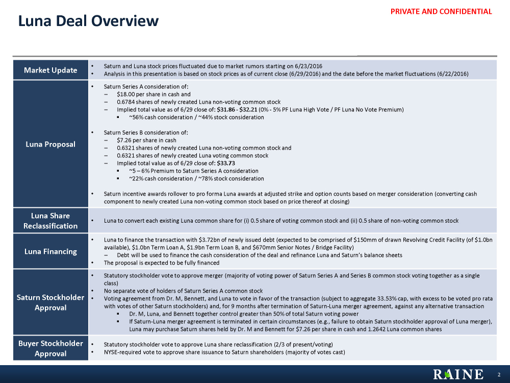 Market Update• Saturn and Luna stock prices fluctuated due to market rumors starting on 6/23/2016 • Analysis in this presentation is based on stock prices as of current close (6/29/2016) and the date before the market fluctuations (6/22/2016) Luna Proposal• Saturn Series A consideration of: – $18.00 per share in cash and – 0.6784 shares of newly created Luna non-voting common stock – Implied total value as of 6/29 close of: $31.86 - $32.21 (0% - 5% PF Luna High Vote / PF Luna No Vote Premium) § ~56% cash consideration / ~44% stock consideration • Saturn Series B consideration of: – $7.26 per share in cash – 0.6321 shares of newly created Luna non-voting common stock and – 0.6321 shares of newly created Luna voting common stock – Implied total value as of 6/29 close of: $33.73 § ~5 – 6% Premium to Saturn Series A consideration § ~22% cash consideration / ~78% stock consideration • Saturn incentive awards rollover to pro forma Luna awards at adjusted strike and option counts based on merger consideration (converting cash component to newly created Luna non-voting common stock based on price thereof at closing) Luna Share Reclassification• Luna to convert each existing Luna common share for (i) 0.5 share of voting common stock and (ii) 0.5 share of non-voting common stock Luna Financing• Luna to finance the transaction with $3.72bn of newly issued debt (expected to be comprised of $150mm of drawn Revolving Credit Facility (of $1.0bn available), $1.0bn Term Loan A, $1.9bn Term Loan B, and $670mm Senior Notes / Bridge Facility) – Debt will be used to finance the cash consideration of the deal and refinance Luna and Saturn’s balance sheets • The proposal is expected to be fully financed Saturn Stockholder Approval• Statutory stockholder vote to approve merger (majority of voting power of Saturn Series A and Series B common stock voting together as a single class) • No separate vote of holders of Saturn Series A common stock • Voting agreement from Dr. M, Bennett, and Luna to vote in favor of the transaction (subject to aggregate 33.53% cap, with excess to be voted pro rata with votes of other Saturn stockholders) and, for 9 months after termination of Saturn-Luna merger agreement, against any alternative transaction § Dr. M, Luna, and Bennett together control greater than 50% of total Saturn voting power § If Saturn-Luna merger agreement is terminated in certain circumstances (e.g., failure to obtain Saturn stockholder approval of Luna merger), Luna may purchase Saturn shares held by Dr. M and Bennett for $7.26 per share in cash and 1.2642 Luna common shares Buyer Stockholder Approval• Statutory stockholder vote to approve Luna share reclassification (2/3 of present/voting) • NYSE-required vote to approve share issuance to Saturn shareholders (majority of votes cast)