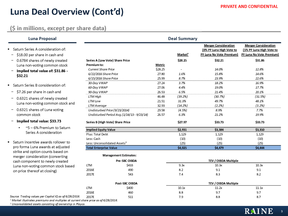 PRIVATE AND CONFIDENTIAL Market¹ Merger Consideration (0% PF Luna High Vote to PF Luna No Vote Premium) Merger Consideration (5% PF Luna High Vote to PF Luna No Vote Premium) Series A (Low Vote) Share Price $28.25 $32.21 $31.86 Premium to: Metric Current Share Price $28.25 - 14.0% 12.8% 6/22/2016 Share Price 27.80 1.6% 15.8% 14.6% 6/15/2016 Share Price 25.99 8.7% 23.9% 22.6% 30-Day VWAP 27.24 3.7% 18.2% 16.9% 60-Day VWAP 27.06 4.4% 19.0% 17.7% 90-Day VWAP 26.53 6.5% 21.4% 20.1% LTM High 46.48 (39.2%) (30.7%) (31.5%) LTM Low 21.51 31.3% 49.7% 48.1% LTM Average 32.93 (14.2%) (2.2%) (3.2%) Undisturbed Price (9/23/2014) 29.58 (4.5%) 8.9% 7.7% Undisturbed Period Avg.(1/14/13 - 9/23/14) 26.57 6.3% 21.2% 19.9% Series B (High Vote) Share Price $27.97 $33.73 $33.73 Implied Equity Value $2,931 $3,384 $3,350 Plus: Total Debt 1,129 1,129 1,129 Less: Cash (10) (10) (10) Less: Unconsolidated Assets² (25) (25) (25) Total Enterprise Value $4,025 $4,479 $4,444 Management Estimates: Pre-SBC OIBDA TEV / OIBDA Multiple LTM $433 9.3x 10.3x 10.3x 2016E 490 8.2 9.1 9.1 2017E 543 7.4 8.3 8.2 Post-SBC OIBDA TEV / OIBDA Multiple LTM $400 10.1x 11.2x 11.1x 2016E 460 8.8 9.7 9.7 2017E 511 7.9 8.8 8.7 Luna Deal Overview (Cont’d) ($ in millions, except per share data) Source: Trading values per Capital IQ as of 6/29/2016. 1 Market illustrates premiums and multiples at current share price as of 6/29/2016. 2 Unconsolidated assets consisting of ownership in Playco. 3 Luna Proposal Deal Summary § Saturn Series A consideration of: − $18.00 per share in cash and − 0.6784 shares of newly created Luna non-voting common stock − Implied total value of: $31.86 - $32.21 § Saturn Series B consideration of: − $7.26 per share in cash and − 0.6321 shares of newly created Luna non-voting common stock and − 0.6321 shares of Luna voting common stock − Implied total value: $33.73 • ~5 – 6% Premium to Saturn Series A consideration § Saturn incentive awards rollover to pro forma Luna awards at adjusted strike and option counts based on merger consideration (converting cash component to newly created Luna non-voting common stock based on price thereof at closing)