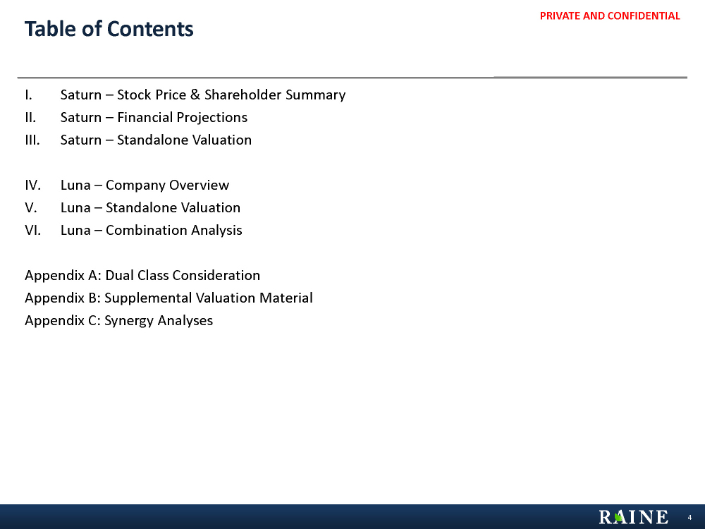 PRIVATE AND CONFIDENTIAL Table of Contents I. Saturn – Stock Price & Shareholder Summary II. Saturn – Financial Projections III. Saturn – Standalone Valuation IV. Luna – Company Overview V. Luna – Standalone Valuation VI. Luna – Combination Analysis Appendix A: Dual Class Consideration Appendix B: Supplemental Valuation Material Appendix C: Synergy Analyses 4