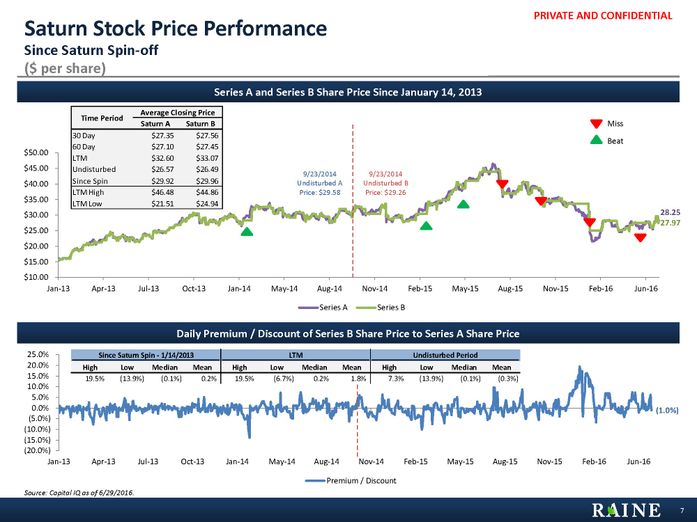PRIVATE AND CONFIDENTIAL 0.000 2.000 4.000 6.000 8.000 10.000 12.000 14.000 16.000 18.000 - $5.00 $10.00 $15.00 $20.00 $25.00 $30.00 $35.00 $40.00 $45.00 $50.00Jan-13 Apr-13 Jul-13 Oct-13 Jan-14 May-14 Aug-14 Nov-14 Feb-15 May-15 Aug-15 Nov-15 Feb-16 Jun-16 Volume (mm)Share Price ($) Volume (mm) Closing Share Price ($) Undisturbed Period Avg. Price: $26.57 Performance Saturn S&P 500 30 Day 4.6% (2.9%) 60 Day 3.8% (1.4%) LTM (36.1%) (1.0%) Since Spin 81.2% 38.4% Time Period Annotated Stock Price Performance Series A Shares – Since Saturn Spin-off Source: Capital IQ as of 6/29/2016. Comments per publicly available information. 6 9/23/2014: Fox reportedly interested in purchasing Saturn 1/14/2013: Completes spin-off from Liberty Media 7/29/2015: Saturn reports Q2 results – profits fall nearly 10% year over year 2/05/2016: Luna stock drops by 27% 2/04/2016: Luna files 13D declaring it is exploring a mutually beneficial combination of the two companies 3/27/2015: Luna completes acquisition of 4.63% stake, 13D filed on 3/30/2015 11/24/2014: Rumor Period Avg. Price: $33.14 2/25/2016: Saturn CEO, Chris Albrecht, speaks in favor of consolidation 9/23/2014 Undisturbed A Price: $29.58 3/14/2016: 6/23/2016: Luna + Saturn merger rumors 6/24/2016: Brexit referendum result