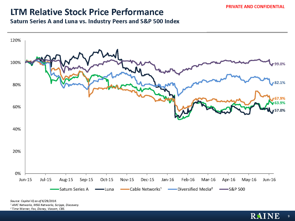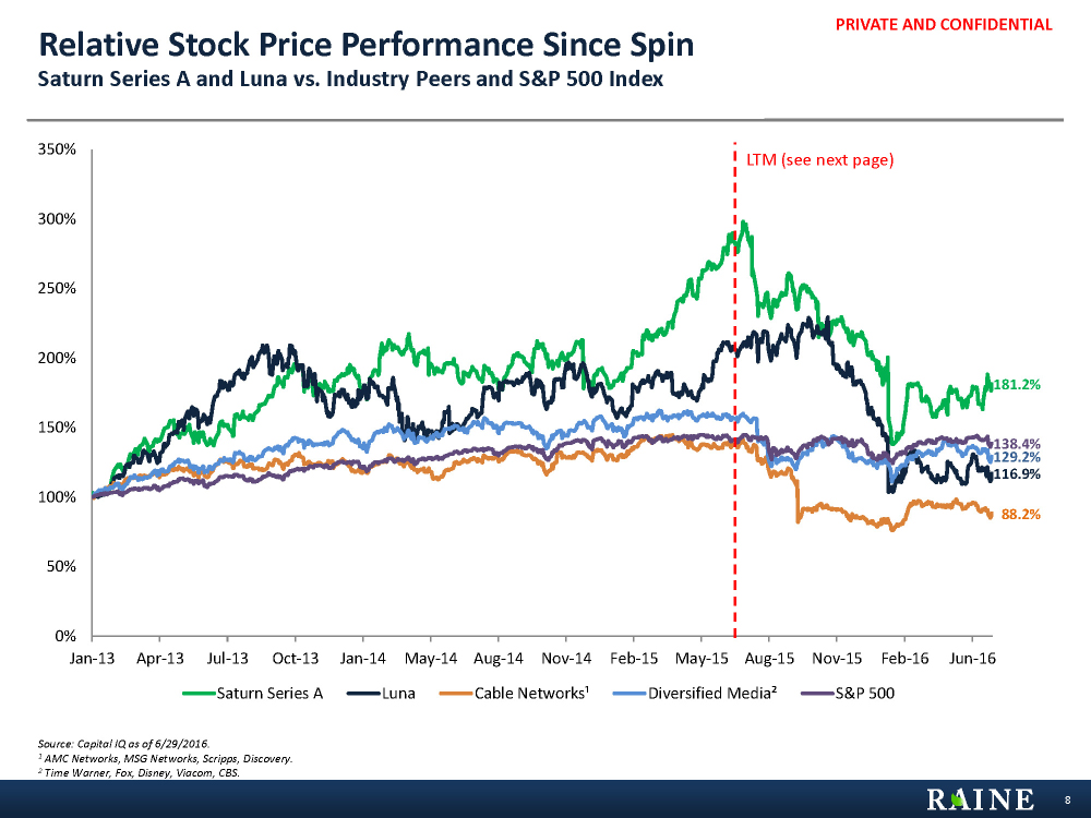 PRIVATE AND CONFIDENTIAL 181.2% 116.9% 88.2% 129.2% 138.4% 0% 50% 100% 150% 200% 250% 300% 350%Jan-13 Apr-13 Jul-13 Oct-13 Jan-14 May-14 Aug-14 Nov-14 Feb-15 May-15 Aug-15 Nov-15 Feb-16 Jun-16 Saturn Series A Luna Cable Networks¹ Diversified Media² S&P 500 Relative Stock Price Performance Since Spin Saturn Series A and Luna vs. Industry Peers and S&P 500 Index Source: Capital IQ as of 6/29/2016. 1 AMC Networks, MSG Networks, Scripps, Discovery. 2 Time Warner, Fox, Disney, Viacom, CBS. 8 LTM (see next page)