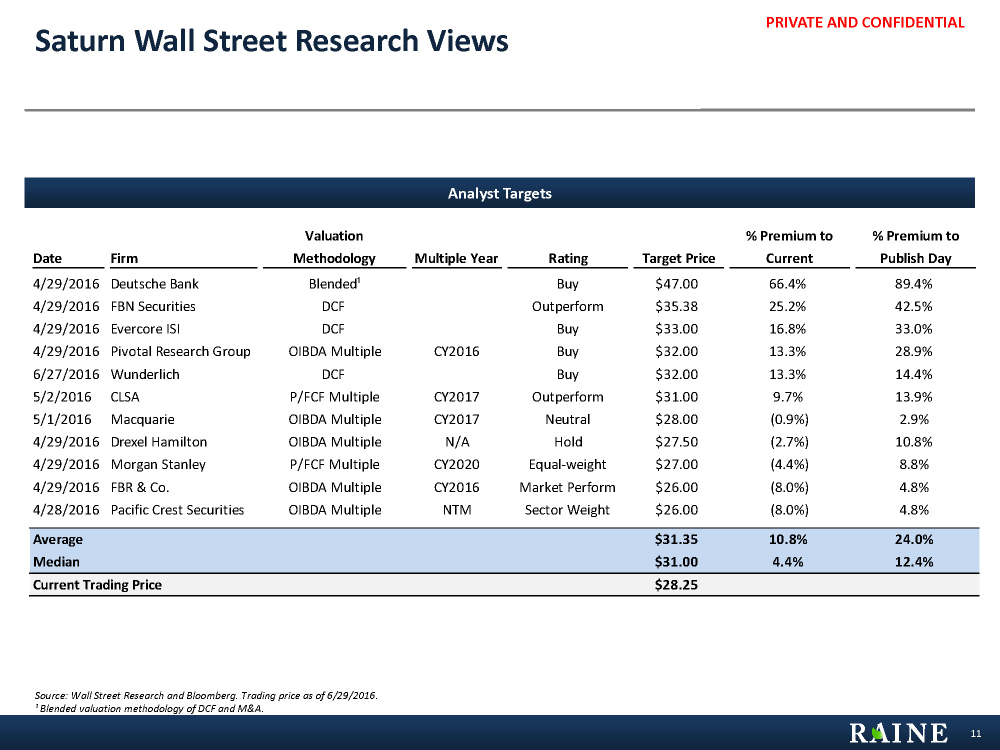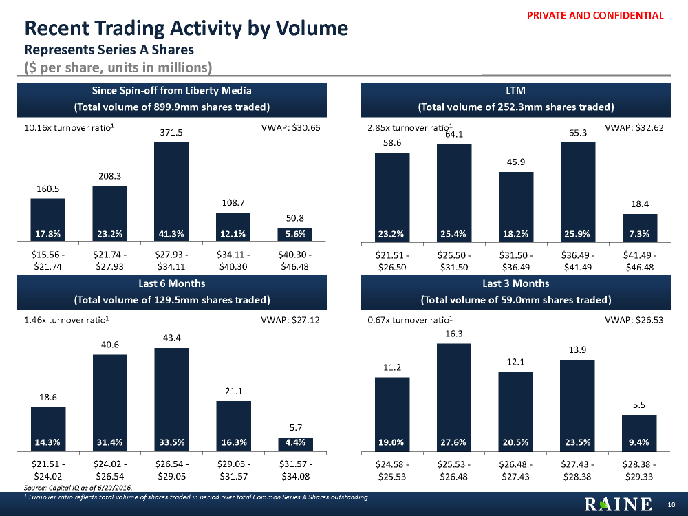 PRIVATE AND CONFIDENTIAL 58.6 64.1 45.9 65.3 18.4 $21.51 - $26.50 $26.50 - $31.50 $31.50 - $36.49 $36.49 - $41.49 $41.49 - $46.48 18.6 40.6 43.4 21.1 5.7 $21.51 - $24.02 $24.02 - $26.54 $26.54 - $29.05 $29.05 - $31.57 $31.57 - $34.08 11.2 16.3 12.1 13.9 5.5 $24.58 - $25.53 $25.53 - $26.48 $26.48 - $27.43 $27.43 - $28.38 $28.38 - $29.33 160.5 208.3 371.5 108.7 50.8 $15.56 - $21.74 $21.74 - $27.93 $27.93 - $34.11 $34.11 - $40.30 $40.30 - $46.48 Since Spin-off from Liberty Media (Total volume of 899.9mm shares traded) LTM (Total volume of 252.3mm shares traded) Last 6 Months (Total volume of 129.5mm shares traded) Last 3 Months (Total volume of 59.0mm shares traded) Source: Capital IQ as of 6/29/2016. 1 Turnover ratio reflects total volume of shares traded in period over total Common Series A Shares outstanding. 10 Recent Trading Activity by Volume Represents Series A Shares ($ per share, units in millions) VWAP: $30.66 VWAP: $26.53 VWAP: $27.12 VWAP: $32.62 10.16x turnover ratio1 1.46x turnover ratio1 0.67x turnover ratio1 19.0% 27.6% 20.5% 23.5% 9.4% 23.2% 25.4% 18.2% 25.9% 7.3% 17.8% 23.2% 41.3% 12.1% 5.6% 2.85x turnover ratio1 14.3% 31.4% 33.5% 16.3% 4.4%