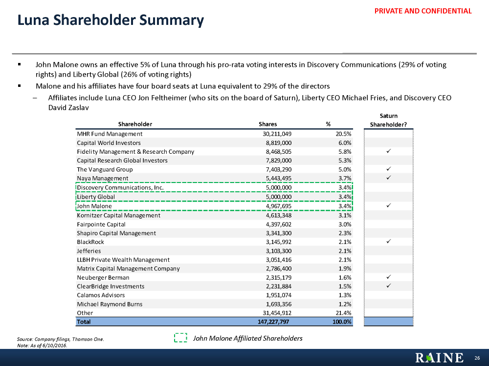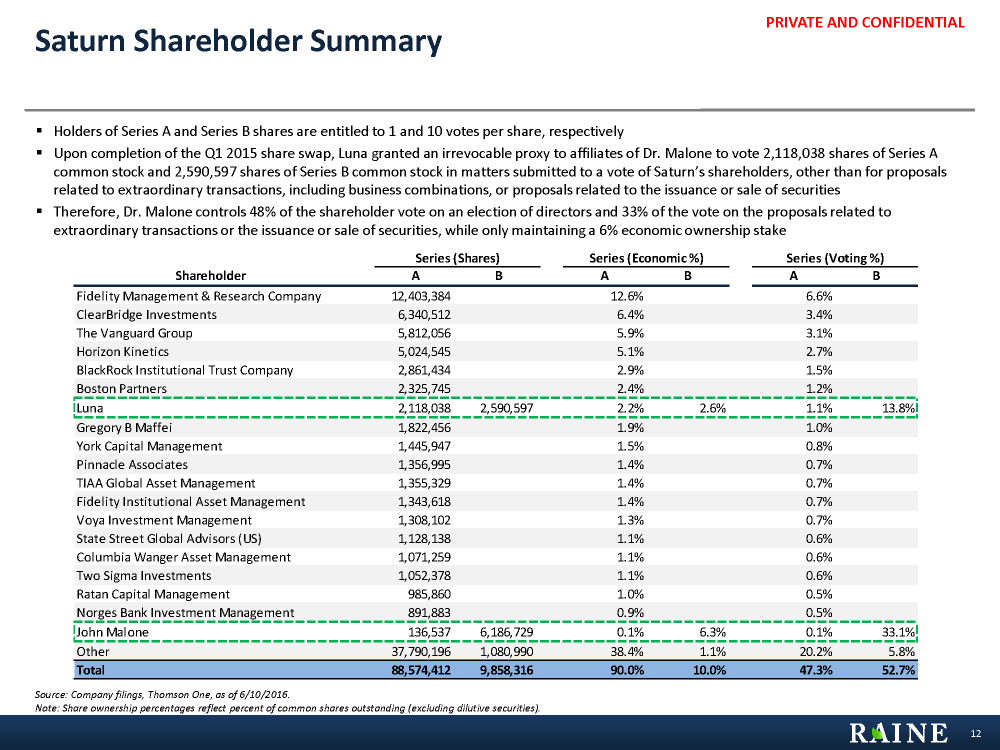 PRIVATE AND CONFIDENTIAL Saturn Shareholder Summary Source: Company filings, Thomson One, as of 6/10/2016. Note: Share ownership percentages reflect percent of common shares outstanding (excluding dilutive securities). § Holders of Series A and Series B shares are entitled to 1 and 10 votes per share, respectively § Upon completion of the Q1 2015 share swap, Luna granted an irrevocable proxy to affiliates of Dr. Malone to vote 2,118,038 shares of Series A common stock and 2,590,597 shares of Series B common stock in matters submitted to a vote of Saturn’s shareholders, other than for proposals related to extraordinary transactions, including business combinations, or proposals related to the issuance or sale of securities § Therefore, Dr. Malone controls 48% of the shareholder vote on an election of directors and 33% of the vote on the proposals related to extraordinary transactions or the issuance or sale of securities, while only maintaining a 6% economic ownership stake 12 Series (Shares) Series (Economic %) Series (Voting %) Shareholder A B A B A B Fidelity Management & Research Company 12,403,384 12.6% 6.6% ClearBridge Investments 6,340,512 6.4% 3.4% The Vanguard Group 5,812,056 5.9% 3.1% Horizon Kinetics 5,024,545 5.1% 2.7% BlackRock Institutional Trust Company 2,861,434 2.9% 1.5% Boston Partners 2,325,745 2.4% 1.2% Luna 2,118,038 2,590,597 2.2% 2.6% 1.1% 13.8% Gregory B Maffei 1,822,456 1.9% 1.0% York Capital Management 1,445,947 1.5% 0.8% Pinnacle Associates 1,356,995 1.4% 0.7% TIAA Global Asset Management 1,355,329 1.4% 0.7% Fidelity Institutional Asset Management 1,343,618 1.4% 0.7% Voya Investment Management 1,308,102 1.3% 0.7% State Street Global Advisors (US) 1,128,138 1.1% 0.6% Columbia Wanger Asset Management 1,071,259 1.1% 0.6% Two Sigma Investments 1,052,378 1.1% 0.6% Ratan Capital Management 985,860 1.0% 0.5% Norges Bank Investment Management 891,883 0.9% 0.5% John Malone 136,537 6,186,729 0.1% 6.3% 0.1% 33.1% Other 37,790,196 1,080,990 38.4% 1.1% 20.2% 5.8% Total 88,574,412 9,858,316 90.0% 10.0% 47.3% 52.7%