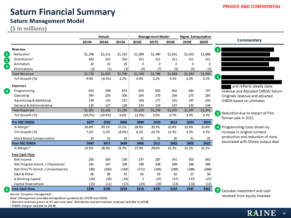 PRIVATE AND CONFIDENTIAL Actuals Management Model Mgmt. Extrapolation 2013A 2014A 2015A 2016E 2017E 2018E 2019E 2020E Revenue Networks¹ $1,298 $1,312 $1,324 $1,389 $1,484 $1,561 $1,623 $1,688 Distribution¹ 450 322 354 315 311 311 311 311 Animation 32 32 25 0 0 0 0 0 Eliminations (2) (1) (3) (4) (7) (5) (5) (5) Total Revenue $1,778 $1,664 $1,700 $1,700 $1,789 $1,868 $1,930 $1,995 YoY Growth (%) 9.0% (6.4%) 2.2% 0.0% 5.2% 4.4% 3.3% 3.4% Expenses Programming 632 598 653 633 665 662 684 707 Operating 394 293 300 264 270 266 275 284 Advertising & Marketing 149 144 157 169 177 191 197 204 General & Administrative 125 127 129 144 134 137 142 146 Total Expenses $1,301 $1,162 $1,239 $1,210 $1,246 $1,255 $1,297 $1,341 YoY Growth (%) (20.2%) (10.6%) 6.6% (2.3%) 3.0% 0.7% 3.3% 3.4% Pre-SBC OIBDA $477 $502 $462 $490 $543 $612 $633 $654 % Margin ² 26.8% 30.1% 27.1% 28.8% 30.3% 32.8% 32.8% 32.8% YoY Growth (%) 7.2% 5.2% (8.0%) 6.2% 10.7% 12.9% 3.3% 3.4% Stock Based Compensation 34 31 33 31 31 30 31 32 Post-SBC OIBDA $443 $471 $429 $460 $511 $582 $602 $622 % Margin ² 24.9% 28.3% 25.2% 27.0% 28.6% 31.2% 31.2% 31.2% Free Cash Flow Net Income 250 269 236 247 287 341 350 363 Net Program Amort. / (Payments) 181 167 199 198 338 288 288 288 Net Film/TV Amort. / (Investments) (90) (260) (194) (272) (284) (288) (288) (288) D&A & Other 66 80 53 65 59 50 57 58 Δ Working Capital (94) (49) (44) 3 (47) (47) (47) (47) Capital Expenditure (15) (11) (17) (24) (19) (13) (13) (13) Free Cash Flow $298 $195 $233 $218 $335 $332 $347 $361 Saturn Financial Summary Saturn Management Model ($ in millions) Source: Company management. Note: Management provided extrapolation guidance for 2019E and 2020E. 1 Network revenues grown at 4% year over year. Distribution and eliminations revenues held flat to 2018E. 2 OIBDA margins held flat to 2018E.