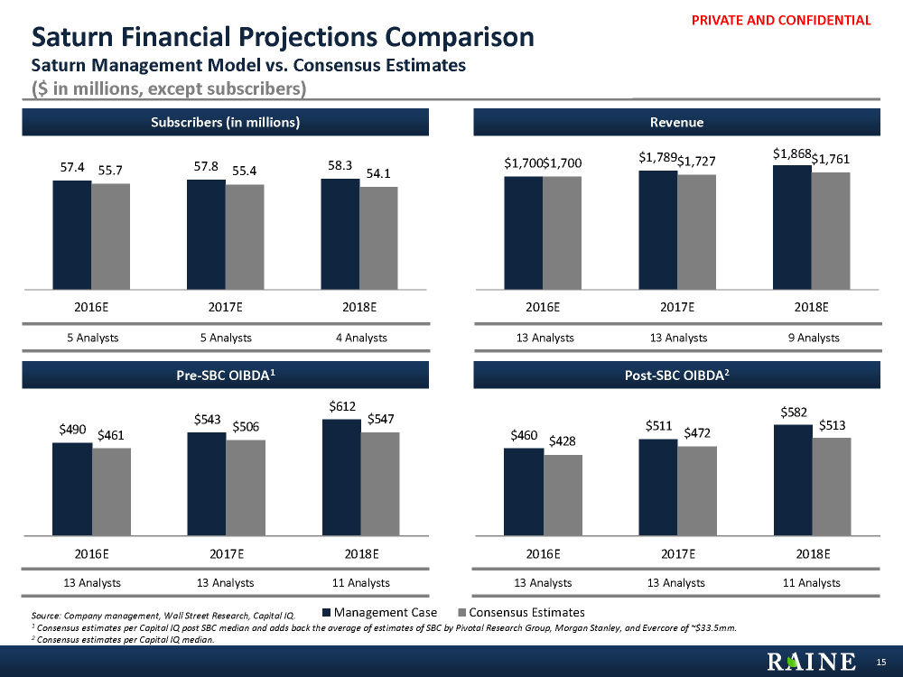 PRIVATE AND CONFIDENTIAL $1,728 $1,828 $1,695 $1,715 2016E 2017E Management Case Consensus Estimates 57.4 57.8 58.3 55.7 55.4 54.1 2016E 2017E 2018E Subscribers (in millions) Revenue Post-SBC OIBDA2 Pre-SBC OIBDA1 15 Saturn Financial Projections Comparison Saturn Management Model vs. Consensus Estimates ($ in millions, except subscribers) Source: Company management, Wall Street Research, Capital IQ. 1 Consensus estimates per Capital IQ post SBC median and adds back the average of estimates of SBC by Pivotal Research Group, Morgan Stanley, and Evercore of ~$33.5mm.