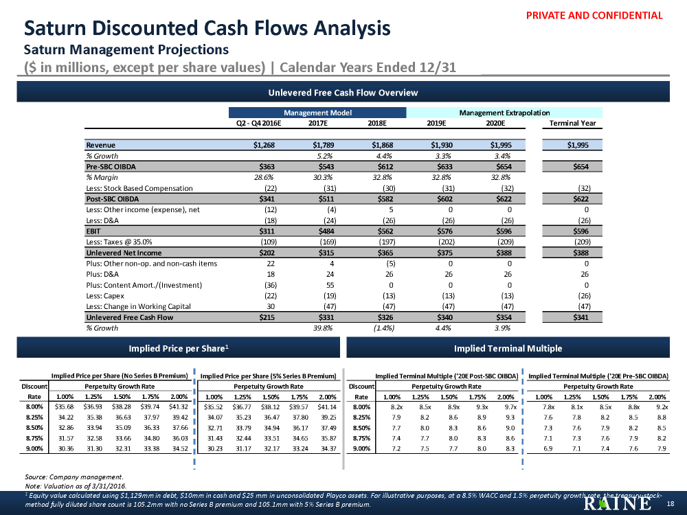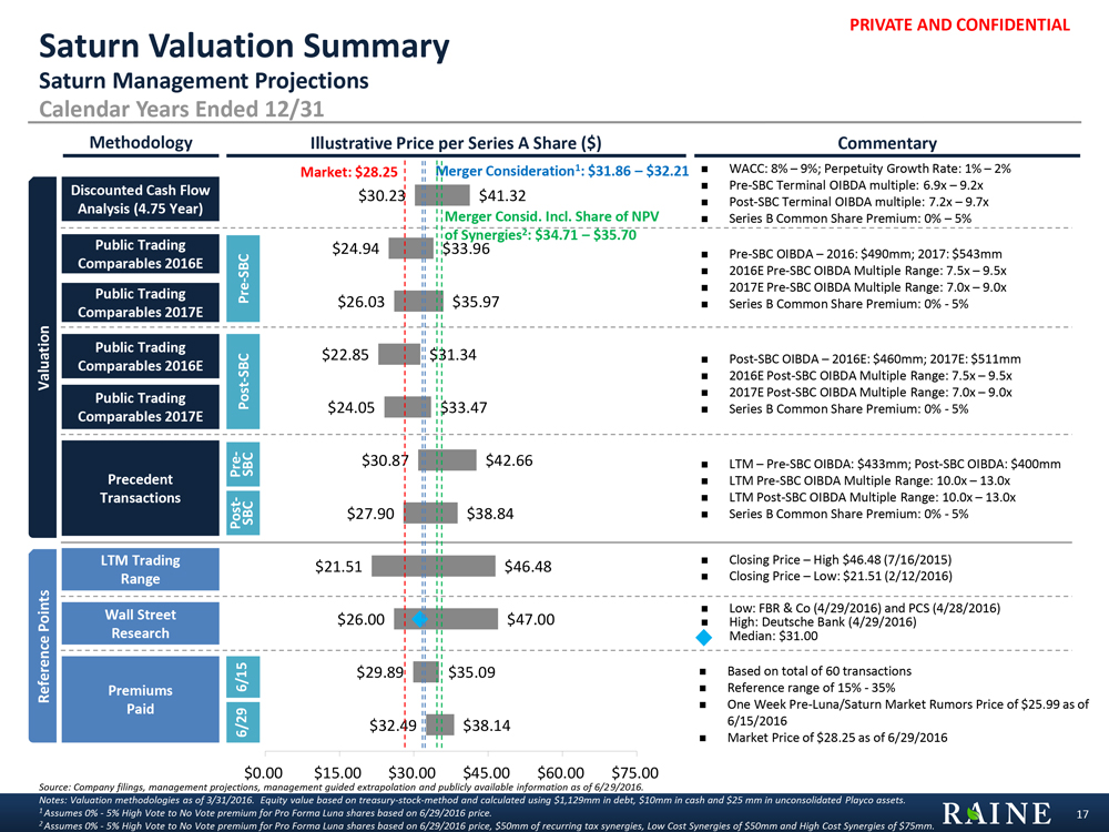 PRIVATE AND CONFIDENTIAL n Post-SBC OIBDA – 2016E: $460mm; 2017E: $511mm n 2016E Post-SBC OIBDA Multiple Range: 7.5x – 9.5x n 2017E Post-SBC OIBDA Multiple Range: 7.0x – 9.0x n Series B Common Share Premium: 0% - 5% Pre- SBC $30.23 $24.94 $26.03 $22.85 $24.05 $30.87 $27.90 $21.51 $26.00 $29.89 $32.49 $41.32 $33.96 $35.97 $31.34 $33.47 $42.66 $38.84 $46.48 $47.00 $35.09 $38.14 $0.00 $15.00 $30.00 $45.00 $60.00 $75.00 Methodology Saturn Valuation Summary Saturn Management Projections Calendar Years Ended 12/31 17 Discounted Cash Flow Analysis (4.75 Year) n Pre-SBC OIBDA – 2016: $490mm; 2017: $543mm n 2016E Pre-SBC OIBDA Multiple Range: 7.5x – 9.5x n 2017E Pre-SBC OIBDA Multiple Range: 7.0x – 9.0x n Series B Common Share Premium: 0% - 5% Illustrative Price per Series A Share ($) Commentary Public Trading Comparables 2016E n Closing Price – High $46.48 (7/16/2015) n Closing Price – Low: $21.51 (2/12/2016) n WACC: 8% – 9%; Perpetuity Growth Rate: 1% – 2% n Pre-SBC Terminal OIBDA multiple: 6.9x – 9.2x n Post-SBC Terminal OIBDA multiple: 7.2x – 9.7x n Series B Common Share Premium: 0% – 5% LTM Trading Range n LTM – Pre-SBC OIBDA: $433mm; Post-SBC OIBDA: $400mm n LTM Pre-SBC OIBDA Multiple Range: 10.0x – 13.0x n LTM Post-SBC OIBDA Multiple Range: 10.0x – 13.0x n Series B Common Share Premium: 0% - 5% Wall Street Research n Low: FBR & Co (4/29/2016) and PCS (4/28/2016) n High: Deutsche Bank (4/29/2016) n Median: $31.00 Source: Company filings, management projections, management guided extrapolation and publicly available information as of 6/29/2016. Notes: Valuation methodologies as of 3/31/2016. Equity value based on treasury-stock-method and calculated using $1,129mm in debt, $10mm in cash and $25 mm in unconsolidated Playco assets. 1 Assumes 0% - 5% High Vote to No Vote premium for Pro Forma Luna shares based on 6/29/2016 price. 2 Assumes 0% - 5% High Vote to No Vote premium for Pro Forma Luna shares based on 6/29/2016 price, $50mm of recurring tax synergies, Low Cost Synergies of $50mm and High Cost Synergies of $75mm. Market: $28.25 Premiums Paid n Based on total of 60 transactions n Reference range of 15% - 35% n One Week Pre-Luna/Saturn Market Rumors Price of $25.99 as of 6/15/2016 n Market Price of $28.25 as of 6/29/2016 Valuation Reference Points Merger Consideration1: $31.86 – $32.21 Precedent Transactions Post- SBC Public Trading Comparables 2017E Public Trading Comparables 2016E Public Trading Comparables 2017E Post-SBC Pre-SBC Merger Consid. Incl. Share of NPV of Synergies2: $34.71 – $35.70 6/15 6/29