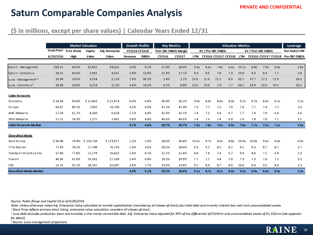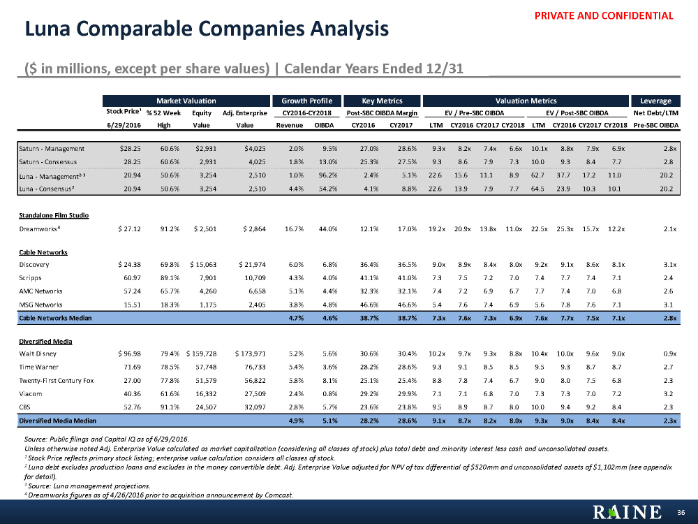 PRIVATE AND CONFIDENTIAL Market Valuation Growth Profile Key Metrics Valuation Metrics Leverage Stock Price¹ % 52 Week Equity Adj. Enterprise CY2016-CY2018 Post-SBC OIBDA Margin EV / Pre-SBC OIBDA EV / Post-SBC OIBDA Net Debt/LTM 6/29/2016 High Value Value Revenue OIBDA CY2016 CY2017 LTM CY2016 CY2017 CY2018 LTM CY2016 CY2017 CY2018 Pre-SBC OIBDA Saturn - Management $28.25 60.6% $2,931 $4,025 2.0% 9.5% 27.0% 28.6% 9.3x 8.2x 7.4x 6.6x 10.1x 8.8x 7.9x 6.9x 2.8x Saturn - Consensus 28.25 60.6% 2,931 4,025 1.8% 13.0% 25.3% 27.5% 9.3 8.6 7.9 7.3 10.0 9.3 8.4 7.7 2.8 Luna - Management², ³ 20.94 50.6% 3,254 2,510 1.0% 96.2% 2.4% 5.1% 22.6 15.6 11.1 8.9 62.7 37.7 17.2 11.0 20.2 Luna - Consensus² 20.94 50.6% 3,254 2,510 4.4% 54.2% 4.1% 8.8% 22.6 13.9 7.9 7.7 64.5 23.9 10.3 10.1 20.2 Standalone Film Studio Dreamworks⁴ $ 27.12 91.2% $ 2,501 $ 2,864 16.7% 44.0% 12.1% 17.0% 19.2x 20.9x 13.8x 11.0x 22.5x 25.3x 15.7x 12.2x 2.1x Cable Networks Discovery $ 24.38 69.8% $ 15,063 $ 21,974 6.0% 6.8% 36.4% 36.5% 9.0x 8.9x 8.4x 8.0x 9.2x 9.1x 8.6x 8.1x 3.1x Scripps 60.97 89.1% 7,901 10,709 4.3% 4.0% 41.1% 41.0% 7.3 7.5 7.2 7.0 7.4 7.7 7.4 7.1 2.4 AMC Networks 57.24 65.7% 4,260 6,658 5.1% 4.4% 32.3% 32.1% 7.4 7.2 6.9 6.7 7.7 7.4 7.0 6.8 2.6 MSG Networks 15.51 18.3% 1,175 2,405 3.8% 4.8% 46.6% 46.6% 5.4 7.6 7.4 6.9 5.6 7.8 7.6 7.1 3.1 Cable Networks Median 4.7% 4.6% 38.7% 38.7% 7.3x 7.6x 7.3x 6.9x 7.6x 7.7x 7.5x 7.1x 2.8x Diversified Media Walt Disney $ 96.98 79.4% $ 159,728 $ 173,971 5.2% 5.6% 30.6% 30.4% 10.2x 9.7x 9.3x 8.8x 10.4x 10.0x 9.6x 9.0x 0.9x Time Warner 71.69 78.5% 57,748 76,733 5.4% 3.6% 28.2% 28.6% 9.3 9.1 8.5 8.5 9.5 9.3 8.7 8.7 2.7 Twenty-First Century Fox 27.00 77.8% 51,579 56,822 5.8% 8.1% 25.1% 25.4% 8.8 7.8 7.4 6.7 9.0 8.0 7.5 6.8 2.3 Viacom 40.36 61.6% 16,332 27,509 2.4% 0.8% 29.2% 29.9% 7.1 7.1 6.8 7.0 7.3 7.3 7.0 7.2 3.2 CBS 52.76 91.1% 24,507 32,097 2.8% 5.7% 23.6% 23.8% 9.5 8.9 8.7 8.0 10.0 9.4 9.2 8.4 2.3 Diversified Media Median 4.9% 5.1% 28.2% 28.6% 9.1x 8.7x 8.2x 8.0x 9.3x 9.0x 8.4x 8.4x 2.3x Luna Comparable Companies Analysis ($ in millions, except per share values) | Calendar Years Ended 12/31 Source: Public filings and Capital IQ as of 6/29/2016. Unless otherwise noted Adj. Enterprise Value calculated as market capitalization (considering all classes of stock) plus total debt and minority interest less cash and unconsolidated assets. 1 Stock Price reflects primary stock listing; enterprise value calculation considers all classes of stock. 2 Luna debt excludes production loans and excludes in the money convertible debt. Adj. Enterprise Value adjusted for NPV of tax differential of $520mm and unconsolidated assets of $1,102mm (see appendix for detail). 3 Source: Luna management projections. 4 Dreamworks figures as of 4/26/2016 prior to acquisition announcement by Comcast. 36