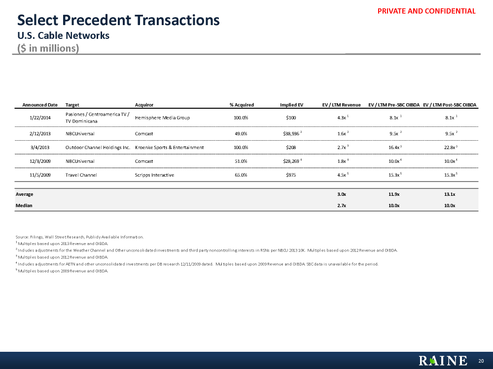 PRIVATE AND CONFIDENTIAL Select Precedent Transactions U.S. Cable Networks ($ in millions) 20 Announced Date Target Acquiror % Acquired Implied EV EV / LTM Revenue EV / LTM Pre-SBC OIBDA EV / LTM Post-SBC OIBDA 1/22/2014 Pasiones / Centroamerica TV / TV Dominicana Hemisphere Media Group 100.0% $100 4.3x 8.1x 8.1x 2/12/2013 NBCUniversal Comcast 49.0% $38,936 1.6x 9.5x 9.5x 3/4/2013 Outdoor Channel Holdings Inc. Kroenke Sports & Entertainment 100.0% $208 2.7x 16.4x 22.8x 12/3/2009 NBCUniversal Comcast 51.0% $28,269 1.8x 10.0x 10.0x 11/5/2009 Travel Channel Scripps Interactive 65.0% $975 4.5x 15.3x 15.3x Average 3.0x 11.9x 13.1x Median 2.7x 10.0x 10.0x Source: Fi l ings , Wal l Street Research, Publ icly Avai lable Information. 1 Mul tiples based upon 2013 Revenue and OIBDA. 2 Includes adjustments for the Weather Channel and Other unconsol idated investments and thi rd party noncontrol l ing interes ts in RSNs per NBCU 2013 10K. Mul tiples based upon 2012 Revenue and OIBDA. 3 Mul tiples based upon 2012 Revenue and OIBDA. 4 Includes adjustments for AETN and other unconsol idated investments per DB research 12/11/2009 dated. Mul tiples based upon 2009 Revenue and OIBDA. SBC data i s unavai lable for the period. 5 Mul tiples based upon 2009 Revenue and OIBDA. 24 1 1 2 2 3 3 4 4 5 5 13524