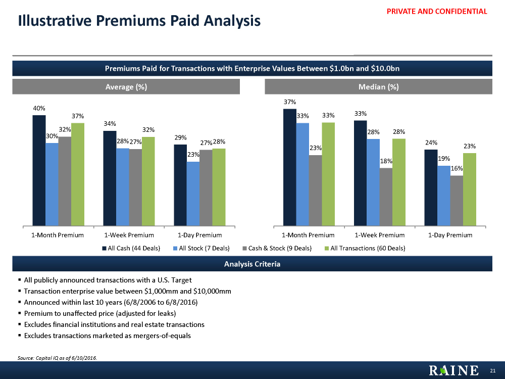 PRIVATE AND CONFIDENTIAL 40% 34% 29% 30% 28% 23% 32% 27% 27% 37% 32% 28% 1-Month Premium 1-Week Premium 1-Day Premium All Cash (44 Deals) All Stock (7 Deals) Cash & Stock (9 Deals) All Transactions (60 Deals) 37% 33% 24% 33% 28% 19% 23% 18% 16% 33% 28% 23% 1-Month Premium 1-Week Premium 1-Day Premium 40% 34% 29% 30% 28% 23% 32% 27% 27% 37% 32% 28% 1-Month Premium 1-Week Premium 1-Day Premium Premiums Paid for Transactions with Enterprise Values Between $1.0bn and $10.0bn § All publicly announced transactions with a U.S. Target § Transaction enterprise value between $1,000mm and $10,000mm § Announced within last 10 years (6/8/2006 to 6/8/2016) § Premium to unaffected price (adjusted for leaks) § Excludes financial institutions and real estate transactions § Excludes transactions marketed as mergers-of-equals Analysis Criteria Source: Capital IQ as of 6/10/2016. 21 Illustrative Premiums Paid Analysis Median (%) Average (%)