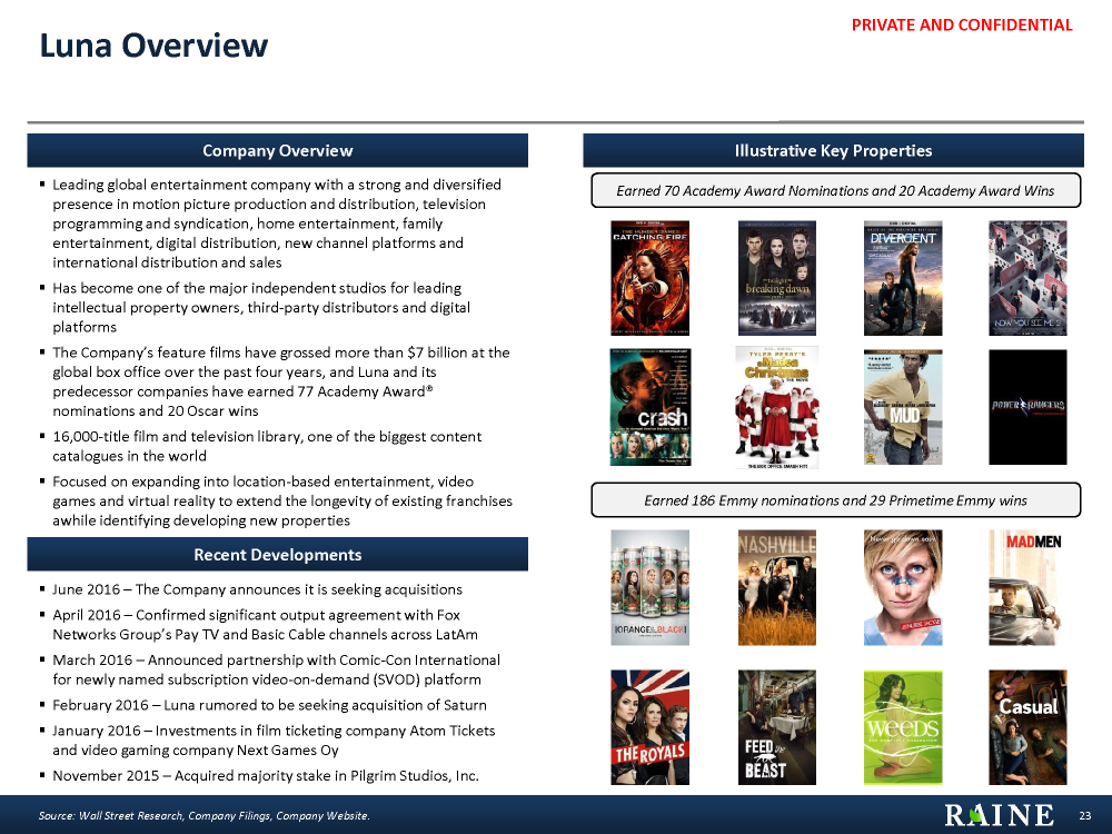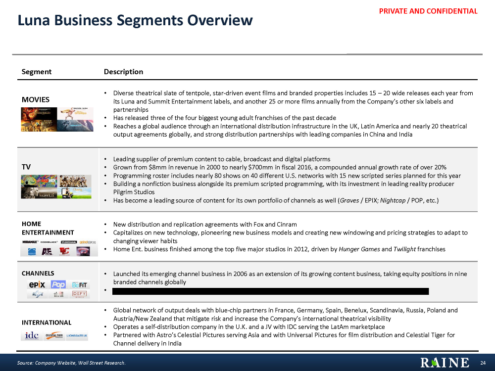 PRIVATE AND CONFIDENTIAL § June 2016 – The Company announces it is seeking acquisitions § April 2016 – Confirmed significant output agreement with Fox Networks Group’s Pay TV and Basic Cable channels across LatAm § March 2016 – Announced partnership with Comic-Con International for newly named subscription video-on-demand (SVOD) platform § February 2016 – Luna rumored to be seeking acquisition of Saturn § January 2016 – Investments in film ticketing company Atom Tickets and video gaming company Next Games Oy § November 2015 – Acquired majority stake in Pilgrim Studios, Inc. § Leading global entertainment company with a strong and diversified presence in motion picture production and distribution, television programming and syndication, home entertainment, family entertainment, digital distribution, new channel platforms and international distribution and sales § Has become one of the major independent studios for leading intellectual property owners, third-party distributors and digital platforms § The Company’s feature films have grossed more than $7 billion at the global box office over the past four years, and Luna and its predecessor companies have earned 77 Academy Award® nominations and 20 Oscar wins § 16,000-title film and television library, one of the biggest content catalogues in the world § Focused on expanding into location-based entertainment, video games and virtual reality to extend the longevity of existing franchises awhile identifying developing new properties 23 Luna Overview Source: Wall Street Research, Company Filings, Company Website. Illustrative Key Properties Recent Developments Company Overview Earned 70 Academy Award Nominations and 20 Academy Award Wins Earned 186 Emmy nominations and 29 Primetime Emmy wins