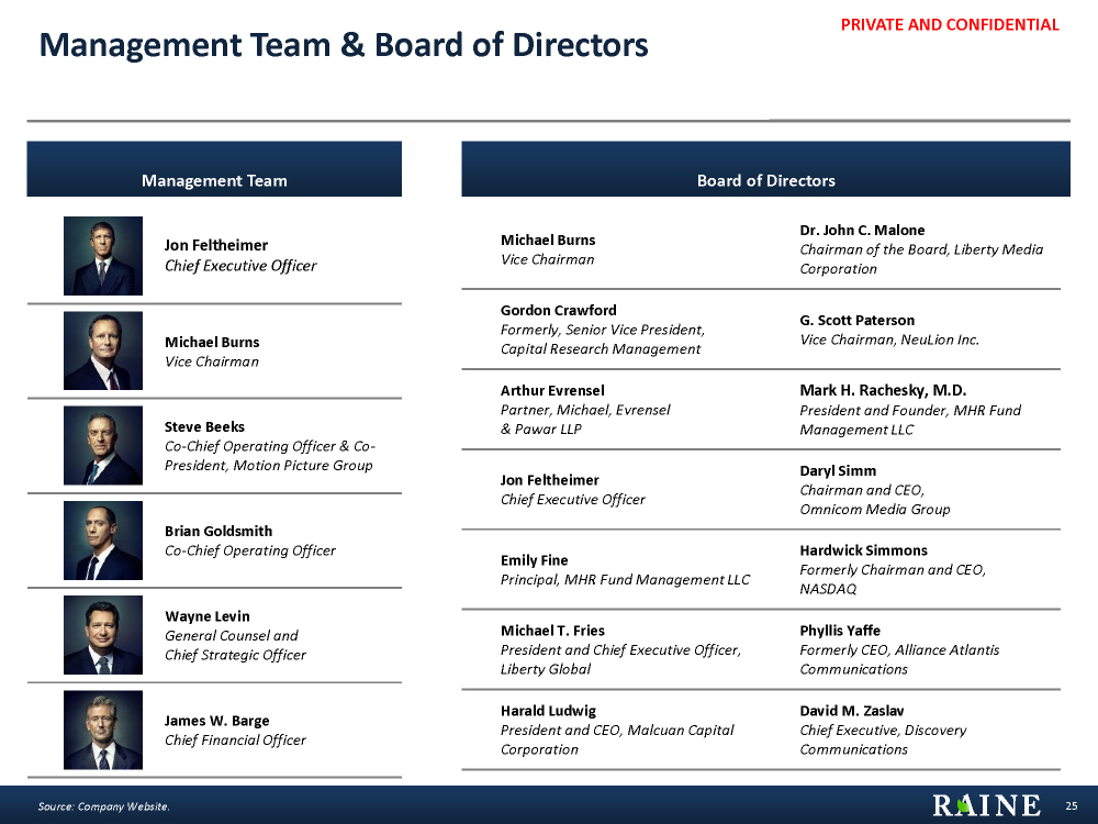 PRIVATE AND CONFIDENTIAL Luna Business Segments Overview 24 Source: Company Website, Wall Street Research. SegmentDescription MOVIES• Diverse theatrical slate of tentpole, star-driven event films and branded properties includes 15 – 20 wide releases each year from its Luna and Summit Entertainment labels, and another 25 or more films annually from the Company’s other six labels and partnerships • Has released three of the four biggest young adult franchises of the past decade • Reaches a global audience through an international distribution infrastructure in the UK, Latin America and nearly 20 theatrical output agreements globally, and strong distribution partnerships with leading companies in China and India TV• Leading supplier of premium content to cable, broadcast and digital platforms • Grown from $8mm in revenue in 2000 to nearly $700mm in fiscal 2016, a compounded annual growth rate of over 20% • Programming roster includes nearly 80 shows on 40 different U.S. networks with 15 new scripted series planned for this year • Building a nonfiction business alongside its premium scripted programming, with its investment in leading reality producer Pilgrim Studios • Has become a leading source of content for its own portfolio of channels as well (Graves / EPIX; Nightcap / POP, etc.) HOME ENTERTAINMENT• New distribution and replication agreements with Fox and Cinram • Capitalizes on new technology, pioneering new business models and creating new windowing and pricing strategies to adapt to changing viewer habits • Home Ent. business finished among the top five major studios in 2012, driven by Hunger Games and Twilight franchises CHANNELS• Launched its emerging channel business in 2006 as an extension of its growing content business, taking equity positions in nine branded channels globally • INTERNATIONAL• Global network of output deals with blue-chip partners in France, Germany, Spain, Benelux, Scandinavia, Russia, Poland and Austria/New Zealand that mitigate risk and increase the Company’s international theatrical visibility • Operates a self-distribution company in the U.K. and a JV with IDC serving the LatAm marketplace • Partnered with Astro’s Celestial Pictures serving Asia and with Universal Pictures for film distribution and Celestial Tiger for Channel delivery in India