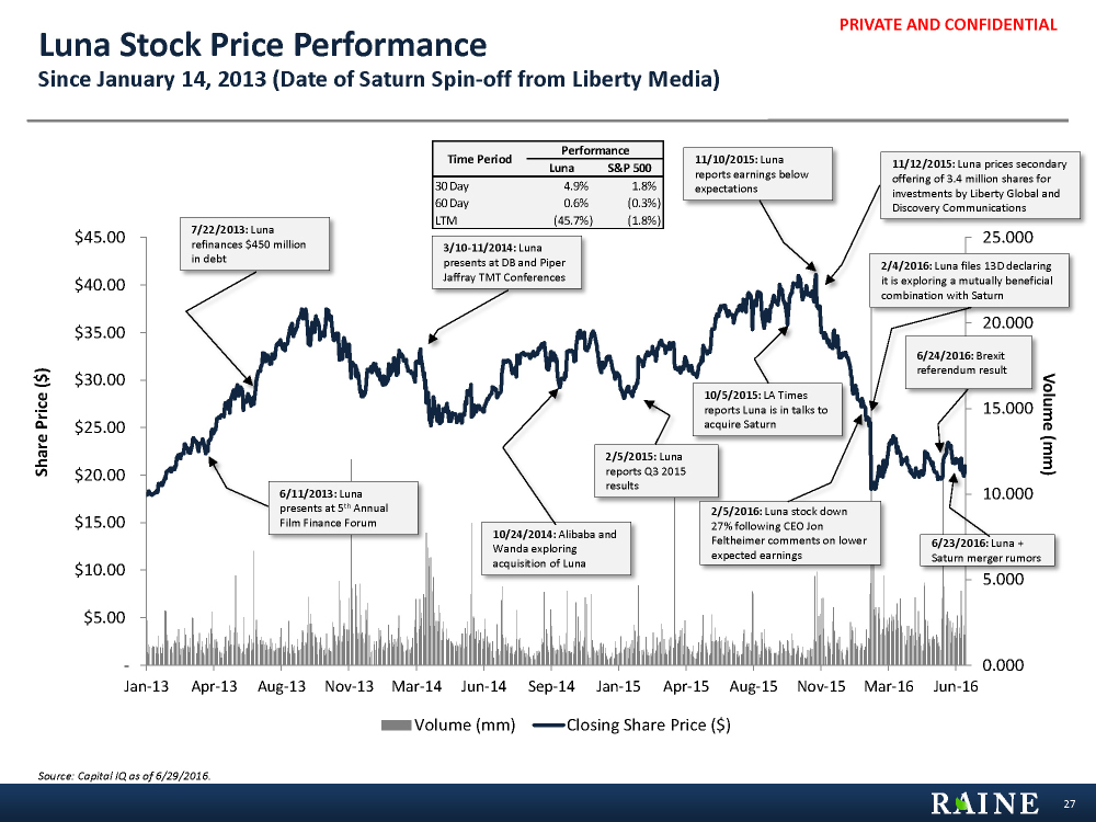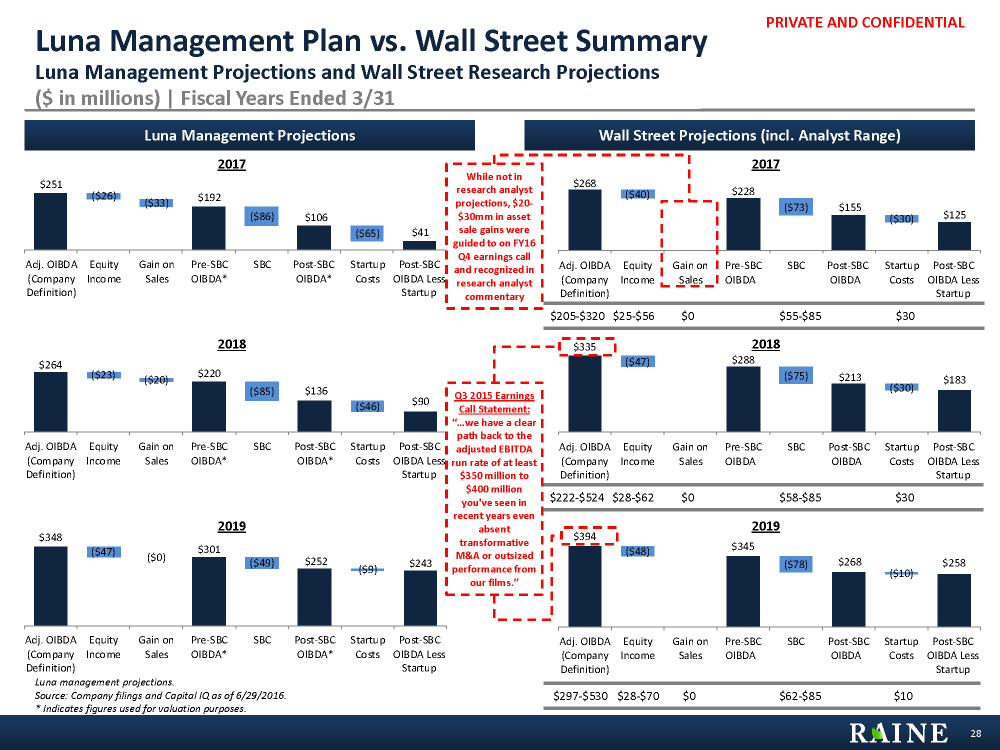 PRIVATE AND CONFIDENTIAL Luna Stock Price Performance Since January 14, 2013 (Date of Saturn Spin-off from Liberty Media) Source: Capital IQ as of 6/29/2016. 27 0.000 5.000 10.000 15.000 20.000 25.000 - $5.00 $10.00 $15.00 $20.00 $25.00 $30.00 $35.00 $40.00 $45.00Jan-13 Apr-13 Aug-13 Nov-13 Mar-14 Jun-14 Sep-14 Jan-15 Apr-15 Aug-15 Nov-15 Mar-16 Jun-16 Volume (mm)Share Price ($) Volume (mm) Closing Share Price ($) Performance Luna S&P 500 30 Day 4.9% 1.8% 60 Day 0.6% (0.3%) LTM (45.7%) (1.8%) Time Period 6/11/2013: Luna presents at 5th Annual Film Finance Forum 7/22/2013: Luna refinances $450 million in debt 3/10-11/2014: Luna presents at DB and Piper Jaffray TMT Conferences 10/24/2014: Alibaba and Wanda exploring acquisition of Luna 2/5/2015: Luna reports Q3 2015 results 10/5/2015: LA Times reports Luna is in talks to acquire Saturn 2/5/2016: Luna stock down 27% following CEO Jon Feltheimer comments on lower expected earnings 2/4/2016: Luna files 13D declaring it is exploring a mutually beneficial combination with Saturn 11/12/2015: Luna prices secondary offering of 3.4 million shares for investments by Liberty Global and Discovery Communications 11/10/2015: Luna reports earnings below expectations 6/23/2016: Luna + Saturn merger rumors 6/24/2016: Brexit referendum result