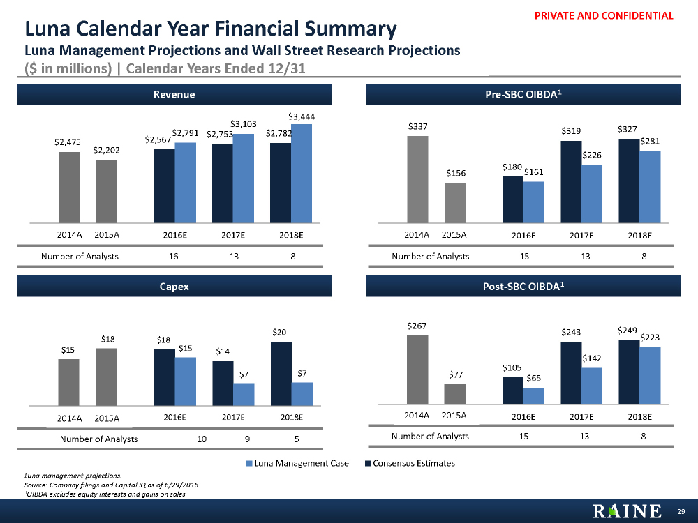 PRIVATE AND CONFIDENTIAL $264 $220 $136 $90 ($23) ($20) ($85) ($46) Adj. OIBDA (Company Definition) Equity Income Gain on Sales Pre-SBC OIBDA* SBC Post-SBC OIBDA* Startup Costs Post-SBC OIBDA Less Startup Luna Management Projections $335 $288 $213 $183 ($47) ($75) ($30) Adj. OIBDA (Company Definition) Equity Income Gain on Sales Pre-SBC OIBDA* SBC Post-SBC OIBDA* Startup Costs Post-SBC OIBDA Less Startup $268 $228 $155 $125 ($40) ($73) ($30) Adj. OIBDA (Company Definition) Equity Income Gain on Sales Pre-SBC OIBDA* SBC Post-SBC OIBDA* Startup Costs Post-SBC OIBDA Less Startup Wall Street Projections (incl. Analyst Range) 28 Luna Management Plan vs. Wall Street Summary Luna Management Projections and Wall Street Research Projections ($ in millions) | Fiscal Years Ended 3/31 Luna management projections. Source: Company filings and Capital IQ as of 6/29/2016.