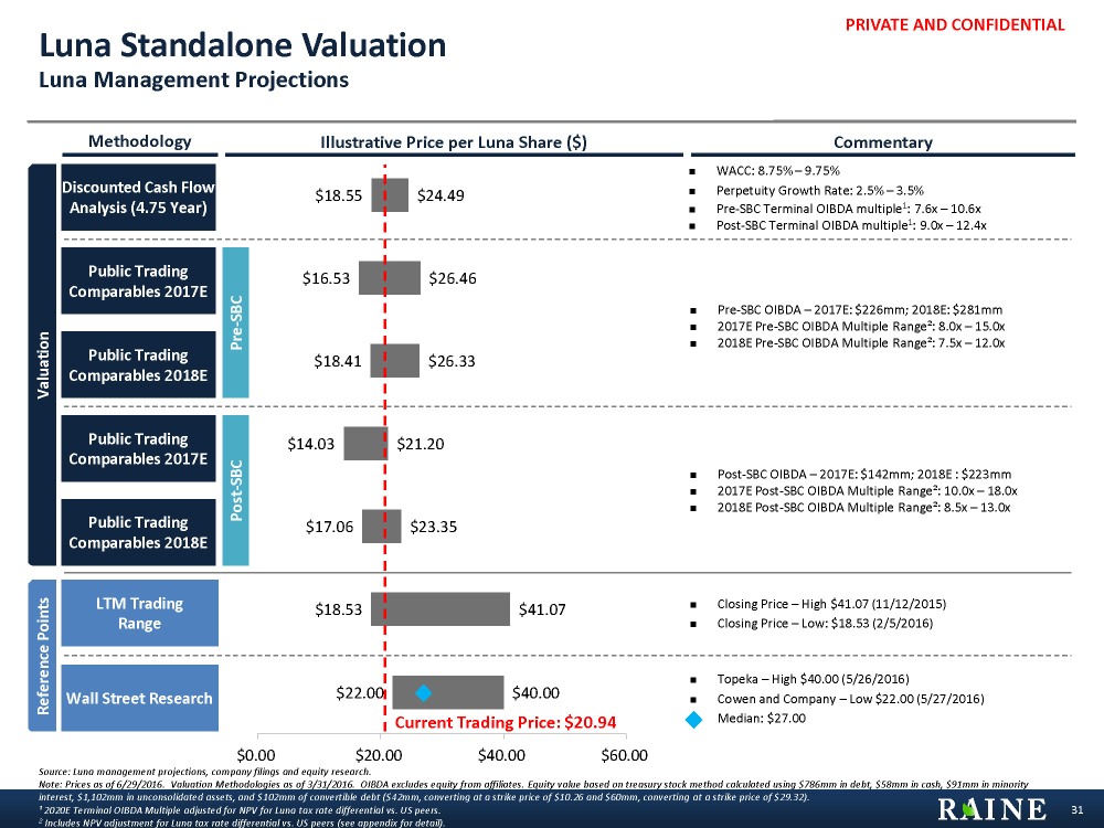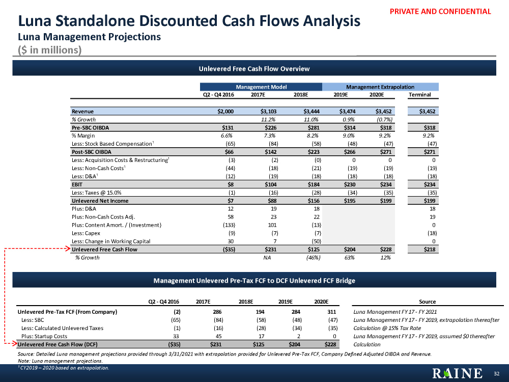 PRIVATE AND CONFIDENTIAL $18.55 $16.53 $18.41 $14.03 $17.06 $18.53 $22.00 $24.49 $26.46 $26.33 $21.20 $23.35 $41.07 $40.00 $0.00 $20.00 $40.00 $60.00 Luna Standalone Valuation Luna Management Projections 31 n Closing Price – High $41.07 (11/12/2015) n Closing Price – Low: $18.53 (2/5/2016) n WACC: 8.75% – 9.75% n Perpetuity Growth Rate: 2.5% – 3.5% n Pre-SBC Terminal OIBDA multiple1: 7.6x – 10.6x n Post-SBC Terminal OIBDA multiple1: 9.0x – 12.4x n Topeka – High $40.00 (5/26/2016) n Cowen and Company – Low $22.00 (5/27/2016) n Median: $27.00 Source: Luna management projections, company filings and equity research. Note: Prices as of 6/29/2016. Valuation Methodologies as of 3/31/2016. OIBDA excludes equity from affiliates. Equity value based on treasury stock method calculated using $786mm in debt, $58mm in cash, $91mm in minority interest, $1,102mm in unconsolidated assets, and $102mm of convertible debt ($42mm, converting at a strike price of $10.26 and $60mm, converting at a strike price of $29.32). ¹ 2020E Terminal OIBDA Multiple adjusted for NPV for Luna tax rate differential vs. US peers. 2 Includes NPV adjustment for Luna tax rate differential vs. US peers (see appendix for detail). Current Trading Price: $20.94 Discounted Cash Flow Analysis (4.75 Year) Post-SBC Valuation Pre-SBC LTM Trading Range Wall Street Research Reference Points n Pre-SBC OIBDA – 2017E: $226mm; 2018E: $281mm n 2017E Pre-SBC OIBDA Multiple Range²: 8.0x – 15.0x n 2018E Pre-SBC OIBDA Multiple Range²: 7.5x – 12.0x Methodology Illustrative Price per Luna Share ($) Commentary Public Trading Comparables 2017E Public Trading Comparables 2018E Public Trading Comparables 2017E Public Trading Comparables 2018E n Post-SBC OIBDA – 2017E: $142mm; 2018E : $223mm n 2017E Post-SBC OIBDA Multiple Range²: 10.0x – 18.0x n 2018E Post-SBC OIBDA Multiple Range²: 8.5x – 13.0x