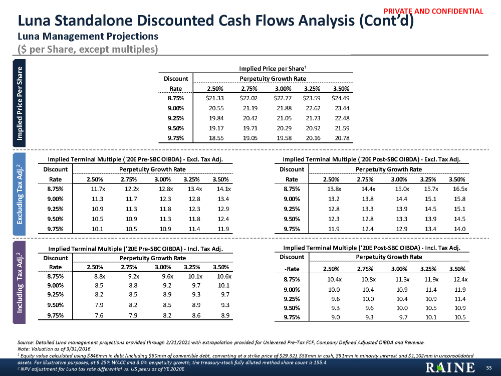 PRIVATE AND CONFIDENTIAL Management Model Management Extrapolation Q2 - Q4 2016 2017E 2018E 2019E 2020E Terminal Revenue $2,000 $3,103 $3,444 $3,474 $3,452 $3,452 % Growth 11.2% 11.0% 0.9% (0.7%) Pre-SBC OIBDA $131 $226 $281 $314 $318 $318 % Margin 6.6% 7.3% 8.2% 9.0% 9.2% 9.2% Less: Stock Based Compensation¹ (65) (84) (58) (48) (47) (47) Post-SBC OIBDA $66 $142 $223 $266 $271 $271 Less: Acquisition Costs & Restructuring¹ (3) (2) (0) 0 0 0 Less: Non-Cash Costs¹ (44) (18) (21) (19) (19) (19) Less: D&A¹ (12) (19) (18) (18) (18) (18) EBIT $8 $104 $184 $230 $234 $234 Less: Taxes @ 15.0% (1) (16) (28) (34) (35) (35) Unlevered Net Income $7 $88 $156 $195 $199 $199 Plus: D&A 12 19 18 18 Plus: Non-Cash Costs Adj. 58 23 22 19 Plus: Content Amort. / (Investment) (133) 101 (13) 0 Less: Capex (9) (7) (7) (18) Less: Change in Working Capital 30 7 (50) 0 Unlevered Free Cash Flow ($35) $231 $125 $204 $228 $218 % Growth NA (46%) 63% 12% Unlevered Free Cash Flow Overview 32 Luna Standalone Discounted Cash Flows Analysis ($ in millions) Luna Management Projections Source: Detailed Luna management projections provided through 3/31/2021 with extrapolation provided for Unlevered Pre-Tax FCF, Company Defined Adjusted OIBDA and Revenue. Note: Luna management projections. ¹ CY2019 – 2020 based on extrapolation. Q2 - Q4 2016 2017E 2018E 2019E 2020E Source Unlevered Pre-Tax FCF (From Company) (2) 286 194 284 311 Luna Management FY 17 - FY 2021 Less: SBC (65) (84) (58) (48) (47) Luna Management FY 17 - FY 2019, extrapolation thereafter Less: Calculated Unlevered Taxes (1) (16) (28) (34) (35) Calculation @ 15% Tax Rate Plus: Startup Costs 33 45 17 2 0 Luna Management FY 17 - FY 2019, assumed $0 thereafter Unlevered Free Cash Flow (DCF) ($35) $231 $125 $204 $228 Calculation Management Unlevered Pre-Tax FCF to DCF Unlevered FCF Bridge