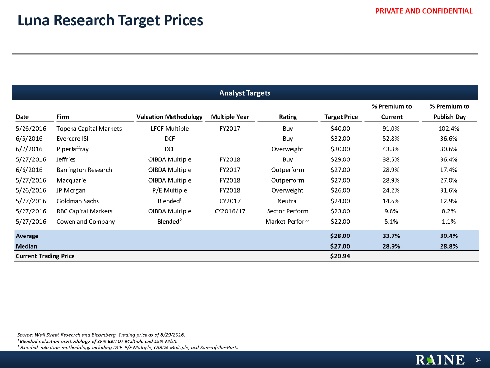 PRIVATE AND CONFIDENTIAL Date Firm Valuation Methodology Multiple Year Rating Target Price % Premium to Current % Premium to Publish Day 5/26/2016 Topeka Capital Markets LFCF Multiple FY2017 Buy $40.00 91.0% 102.4% 6/5/2016 Evercore ISI DCF Buy $32.00 52.8% 36.6% 6/7/2016 PiperJaffray DCF Overweight $30.00 43.3% 30.6% 5/27/2016 Jeffries OIBDA Multiple FY2018 Buy $29.00 38.5% 36.4% 6/6/2016 Barrington Research OIBDA Multiple FY2017 Outperform $27.00 28.9% 17.4% 5/27/2016 Macquarie OIBDA Multiple FY2018 Outperform $27.00 28.9% 27.0% 5/26/2016 JP Morgan P/E Multiple FY2018 Overweight $26.00 24.2% 31.6% 5/27/2016 Goldman Sachs Blended¹ CY2017 Neutral $24.00 14.6% 12.9% 5/27/2016 RBC Capital Markets OIBDA Multiple CY2016/17 Sector Perform $23.00 9.8% 8.2% 5/27/2016 Cowen and Company Blended² Market Perform $22.00 5.1% 1.1% Average $28.00 33.7% 30.4% Median $27.00 28.9% 28.8% Current Trading Price $20.94 Analyst Targets Luna Research Target Prices Source: Wall Street Research and Bloomberg. Trading price as of 6/29/2016. ¹ Blended valuation methodology of 85% EBITDA Multiple and 15% M&A. ² Blended valuation methodology including DCF, P/E Multiple, OIBDA Multiple, and Sum-of-the-Parts. 34