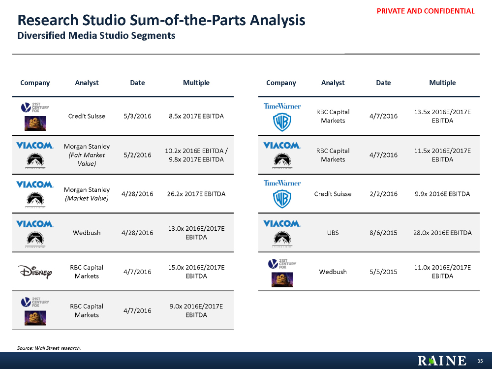 PRIVATE AND CONFIDENTIAL Research Studio Sum-of-the-Parts Analysis Diversified Media Studio Segments Source: Wall Street research.
