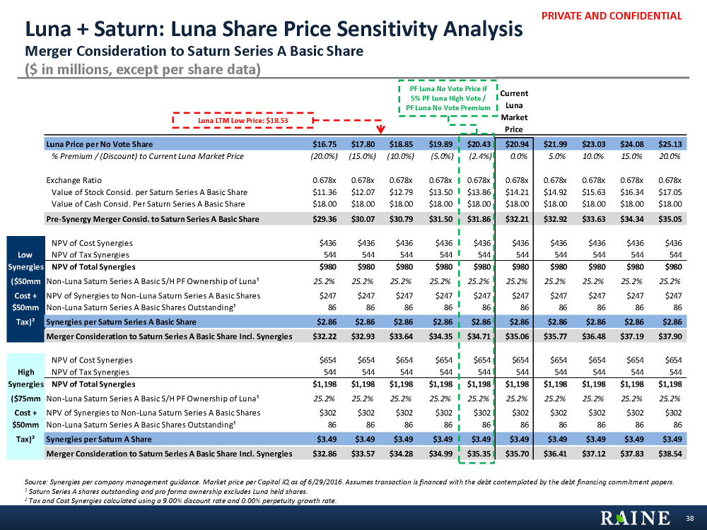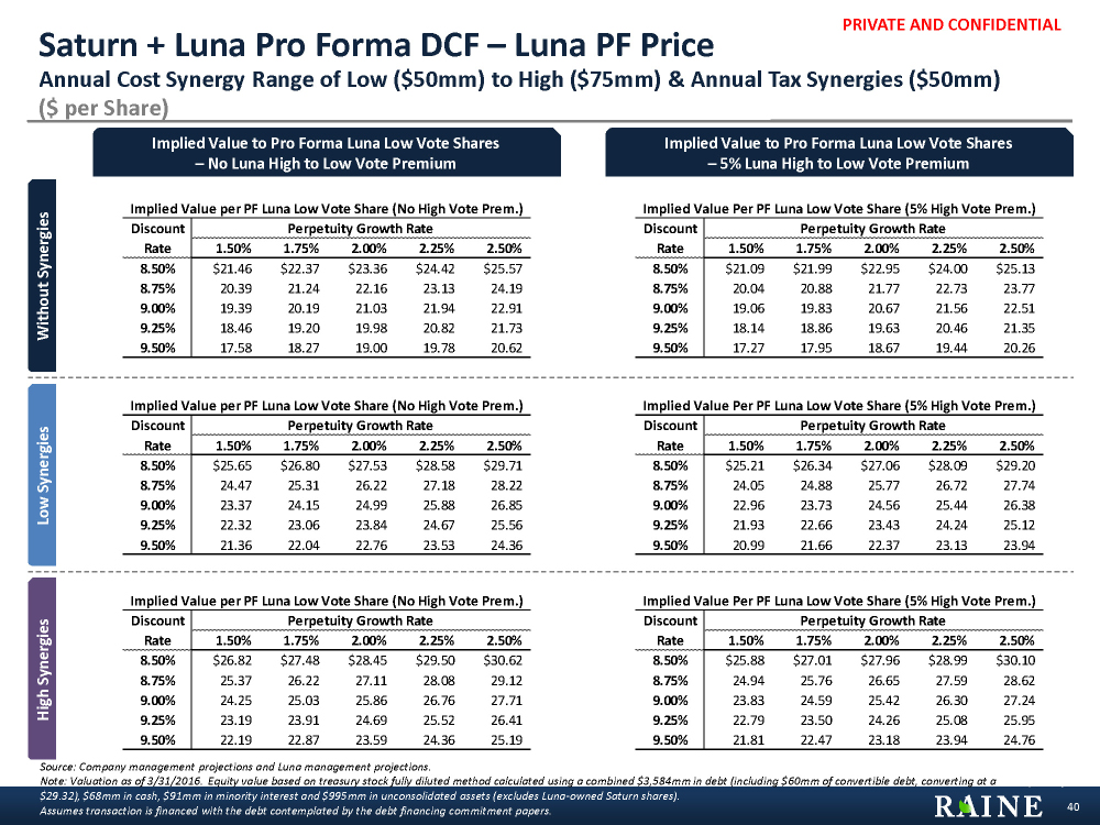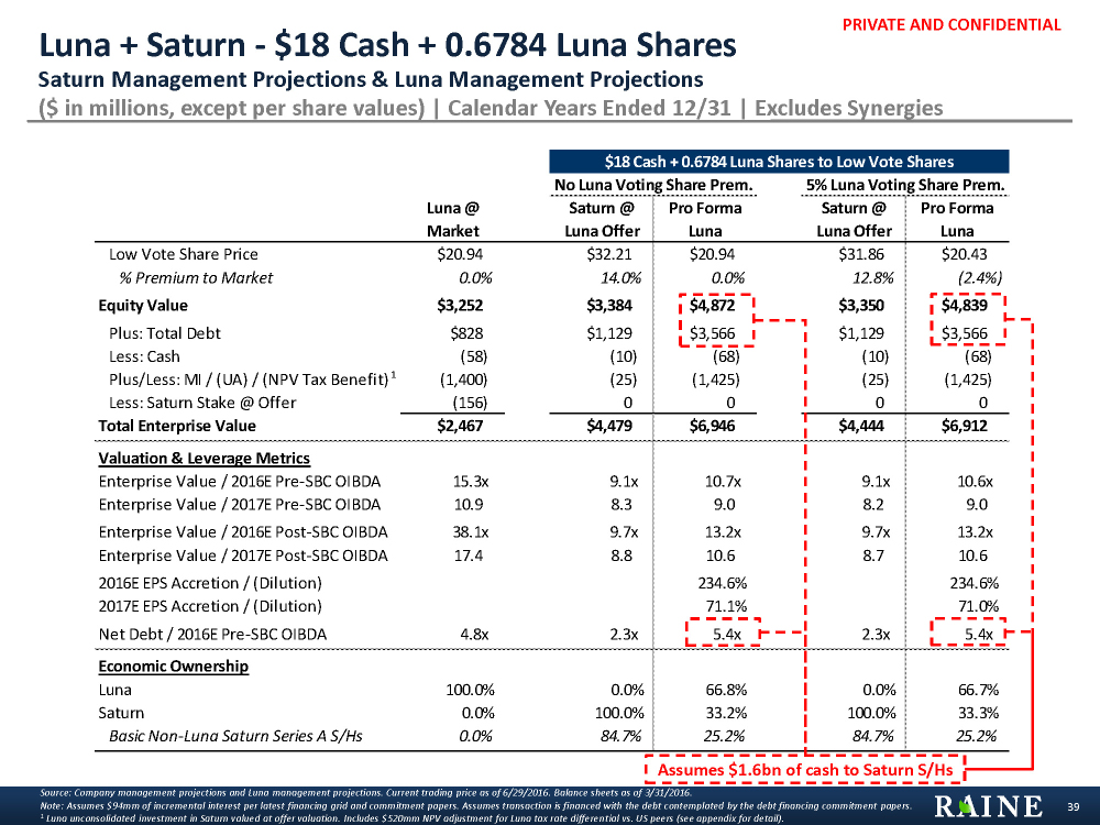 PRIVATE AND CONFIDENTIAL Current Luna Market Price Luna Price per No Vote Share $16.75 $17.80 $18.85 $19.89 $20.43 $20.94 $21.99 $23.03 $24.08 $25.13 % Premium / (Discount) to Current Luna Market Price (20.0%) (15.0%) (10.0%) (5.0%) (2.4%) 0.0% 5.0% 10.0% 15.0% 20.0% Exchange Ratio 0.678x 0.678x 0.678x 0.678x 0.678x 0.678x 0.678x 0.678x 0.678x 0.678x Value of Stock Consid. per Saturn Series A Basic Share $11.36 $12.07 $12.79 $13.50 $13.86 $14.21 $14.92 $15.63 $16.34 $17.05 Value of Cash Consid. Per Saturn Series A Basic Share $18.00 $18.00 $18.00 $18.00 $18.00 $18.00 $18.00 $18.00 $18.00 $18.00 Pre-Synergy Merger Consid. to Saturn Series A Basic Share $29.36 $30.07 $30.79 $31.50 $31.86 $32.21 $32.92 $33.63 $34.34 $35.05 NPV of Cost Synergies $436 $436 $436 $436 $436 $436 $436 $436 $436 $436 Low NPV of Tax Synergies 544 544 544 544 544 544 544 544 544 544 Synergies NPV of Total Synergies $980 $980 $980 $980 $980 $980 $980 $980 $980 $980 ($50mm Non-Luna Saturn Series A Basic S/H PF Ownership of Luna¹ 25.2% 25.2% 25.2% 25.2% 25.2% 25.2% 25.2% 25.2% 25.2% 25.2% Cost + NPV of Synergies to Non-Luna Saturn Series A Basic Shares $247 $247 $247 $247 $247 $247 $247 $247 $247 $247 $50mm Non-Luna Saturn Series A Basic Shares Outstanding¹ 86 86 86 86 86 86 86 86 86 86 Tax)² Synergies per Saturn Series A Basic Share $2.86 $2.86 $2.86 $2.86 $2.86 $2.86 $2.86 $2.86 $2.86 $2.86 Merger Consideration to Saturn Series A Basic Share Incl. Synergies $32.22 $32.93 $33.64 $34.35 $34.71 $35.06 $35.77 $36.48 $37.19 $37.90 NPV of Cost Synergies $654 $654 $654 $654 $654 $654 $654 $654 $654 $654 High NPV of Tax Synergies 544 544 544 544 544 544 544 544 544 544 Synergies NPV of Total Synergies $1,198 $1,198 $1,198 $1,198 $1,198 $1,198 $1,198 $1,198 $1,198 $1,198 ($75mm Non-Luna Saturn Series A Basic S/H PF Ownership of Luna¹ 25.2% 25.2% 25.2% 25.2% 25.2% 25.2% 25.2% 25.2% 25.2% 25.2% Cost + NPV of Synergies to Non-Luna Saturn Series A Basic Shares $302 $302 $302 $302 $302 $302 $302 $302 $302 $302 $50mm Non-Luna Saturn Series A Basic Shares Outstanding¹ 86 86 86 86 86 86 86 86 86 86 Tax)² Synergies per Saturn A Share $3.49 $3.49 $3.49 $3.49 $3.49 $3.49 $3.49 $3.49 $3.49 $3.49 Merger Consideration to Saturn Series A Basic Share Incl. Synergies $32.86 $33.57 $34.28 $34.99 $35.35 $35.70 $36.41 $37.12 $37.83 $38.54 Luna + Saturn: Luna Share Price Sensitivity Analysis Merger Consideration to Saturn Series A Basic Share ($ in millions, except per share data) Source: Synergies per company management guidance. Market price per Capital IQ as of 6/29/2016. Assumes transaction is financed with the debt contemplated by the debt financing commitment papers. 1 Saturn Series A shares outstanding and pro forma ownership excludes Luna held shares. 2 Tax and Cost Synergies calculated using a 9.00% discount rate and 0.00% perpetuity growth rate. 38 PF Luna No Vote Price if 5% PF Luna High Vote / PF Luna No Vote Premium Luna LTM Low Price: $18.53