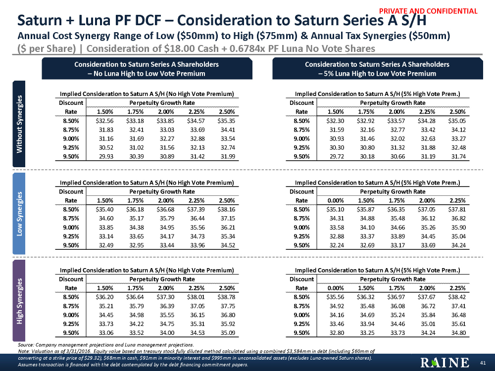 PRIVATE AND CONFIDENTIAL Implied Value Per PF Luna Low Vote Share (5% High Vote Prem.) Discount Perpetuity Growth Rate Rate 1.50% 1.75% 2.00% 2.25% 2.50% 8.50% $25.88 $27.01 $27.96 $28.99 $30.10 8.75% 24.94 25.76 26.65 27.59 28.62 9.00% 23.83 24.59 25.42 26.30 27.24 9.25% 22.79 23.50 24.26 25.08 25.95 9.50% 21.81 22.47 23.18 23.94 24.76 Implied Value Per PF Luna Low Vote Share (5% High Vote Prem.) Discount Perpetuity Growth Rate Rate 1.50% 1.75% 2.00% 2.25% 2.50% 8.50% $25.21 $26.34 $27.06 $28.09 $29.20 8.75% 24.05 24.88 25.77 26.72 27.74 9.00% 22.96 23.73 24.56 25.44 26.38 9.25% 21.93 22.66 23.43 24.24 25.12 9.50% 20.99 21.66 22.37 23.13 23.94 Implied Value Per PF Luna Low Vote Share (5% High Vote Prem.) Discount Perpetuity Growth Rate Rate 1.50% 1.75% 2.00% 2.25% 2.50% 8.50% $21.09 $21.99 $22.95 $24.00 $25.13 8.75% 20.04 20.88 21.77 22.73 23.77 9.00% 19.06 19.83 20.67 21.56 22.51 9.25% 18.14 18.86 19.63 20.46 21.35 9.50% 17.27 17.95 18.67 19.44 20.26 Implied Value per PF Luna Low Vote Share (No High Vote Prem.) Discount Perpetuity Growth Rate Rate 1.50% 1.75% 2.00% 2.25% 2.50% 8.50% $26.82 $27.48 $28.45 $29.50 $30.62 8.75% 25.37 26.22 27.11 28.08 29.12 9.00% 24.25 25.03 25.86 26.76 27.71 9.25% 23.19 23.91 24.69 25.52 26.41 9.50% 22.19 22.87 23.59 24.36 25.19 Implied Value per PF Luna Low Vote Share (No High Vote Prem.) Discount Perpetuity Growth Rate Rate 1.50% 1.75% 2.00% 2.25% 2.50% 8.50% $25.65 $26.80 $27.53 $28.58 $29.71 8.75% 24.47 25.31 26.22 27.18 28.22 9.00% 23.37 24.15 24.99 25.88 26.85 9.25% 22.32 23.06 23.84 24.67 25.56 9.50% 21.36 22.04 22.76 23.53 24.36 Implied Value per PF Luna Low Vote Share (No High Vote Prem.) Discount Perpetuity Growth Rate Rate 1.50% 1.75% 2.00% 2.25% 2.50% 8.50% $21.46 $22.37 $23.36 $24.42 $25.57 8.75% 20.39 21.24 22.16 23.13 24.19 9.00% 19.39 20.19 21.03 21.94 22.91 9.25% 18.46 19.20 19.98 20.82 21.73 9.50% 17.58 18.27 19.00 19.78 20.62 Saturn + Luna Pro Forma DCF – Luna PF Price Annual Cost Synergy Range of Low ($50mm) to High ($75mm) & Annual Tax Synergies ($50mm) ($ per Share) 40 Without Synergies Low Synergies High Synergies Implied Value to Pro Forma Luna Low Vote Shares – No Luna High to Low Vote Premium Implied Value to Pro Forma Luna Low Vote Shares – 5% Luna High to Low Vote Premium Source: Company management projections and Luna management projections. Note: Valuation as of 3/31/2016. Equity value based on treasury stock fully diluted method calculated using a combined $3,584mm in debt (including $60mm of convertible debt, converting at a strike price of $29.32), $68mm in cash, $91mm in minority interest and $995mm in unconsolidated assets (excludes Luna-owned Saturn shares). Assumes transaction is financed with the debt contemplated by the debt financing commitment papers.