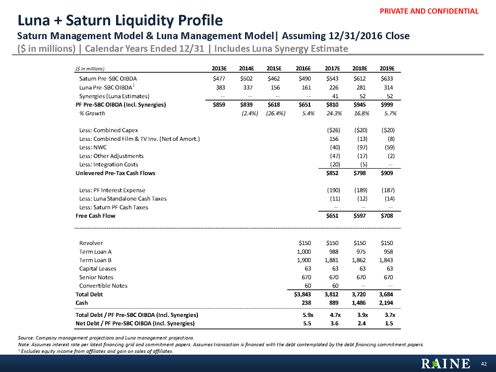 PRIVATE AND CONFIDENTIAL ($ in millions) 2013E 2014E 2015E 2016E 2017E 2018E 2019E Saturn Pre-SBC OIBDA $477 $502 $462 $490 $543 $612 $633 Luna Pre-SBC OIBDA1 383 337 156 161 226 281 314 Synergies (Luna Estimates) -- -- -- -- 41 52 52 PF Pre-SBC OIBDA (Incl. Synergies) $859 $839 $618 $651 $810 $945 $999 % Growth (2.4%) (26.4%) 5.4% 24.3% 16.8% 5.7% Less: Combined Capex ($26) ($20) ($20) Less: Combined Film & TV Inv. (Net of Amort.) 156 (13) (8) Less: NWC (40) (97) (59) Less: Other Adjustments (47) (17) (2) Less: Integration Costs (20) (5) -- Unlevered Pre-Tax Cash Flows $852 $798 $909 Less: PF Interest Expense (190) (189) (187) Less: Luna Standalone Cash Taxes (11) (12) (14) Less: Saturn PF Cash Taxes -- -- -- Free Cash Flow $651 $597 $708 Rate Revolver 3.13% $150 $150 $150 $150 Term Loan A 3.13% 1,000 988 975 958 Term Loan B 4.50% 1,900 1,881 1,862 1,843 Capital Leases 6.25% 63 63 63 63 Senior Notes 9.50% 670 670 670 670 Convertible Notes 1.25% 60 60 -- -- Total Debt $3,843 3,812 3,720 3,684 Cash 238 889 1,486 2,194 Total Debt / PF Pre-SBC OIBDA (Incl. Synergies) 5.9x 4.7x 3.9x 3.7x Net Debt / PF Pre-SBC OIBDA (Incl. Synergies) 5.5 3.6 2.4 1.5 Luna + Saturn Liquidity Profile Saturn Management Model & Luna Management Model| Assuming 12/31/2016 Close ($ in millions) | Calendar Years Ended 12/31 | Includes Luna Synergy Estimate 42 Source: Company management projections and Luna management projections. Note: Assumes interest rate per latest financing grid and commitment papers. Assumes transaction is financed with the debt contemplated by the debt financing commitment papers. 1 Excludes equity income from affiliates and gain on sales of affiliates.
