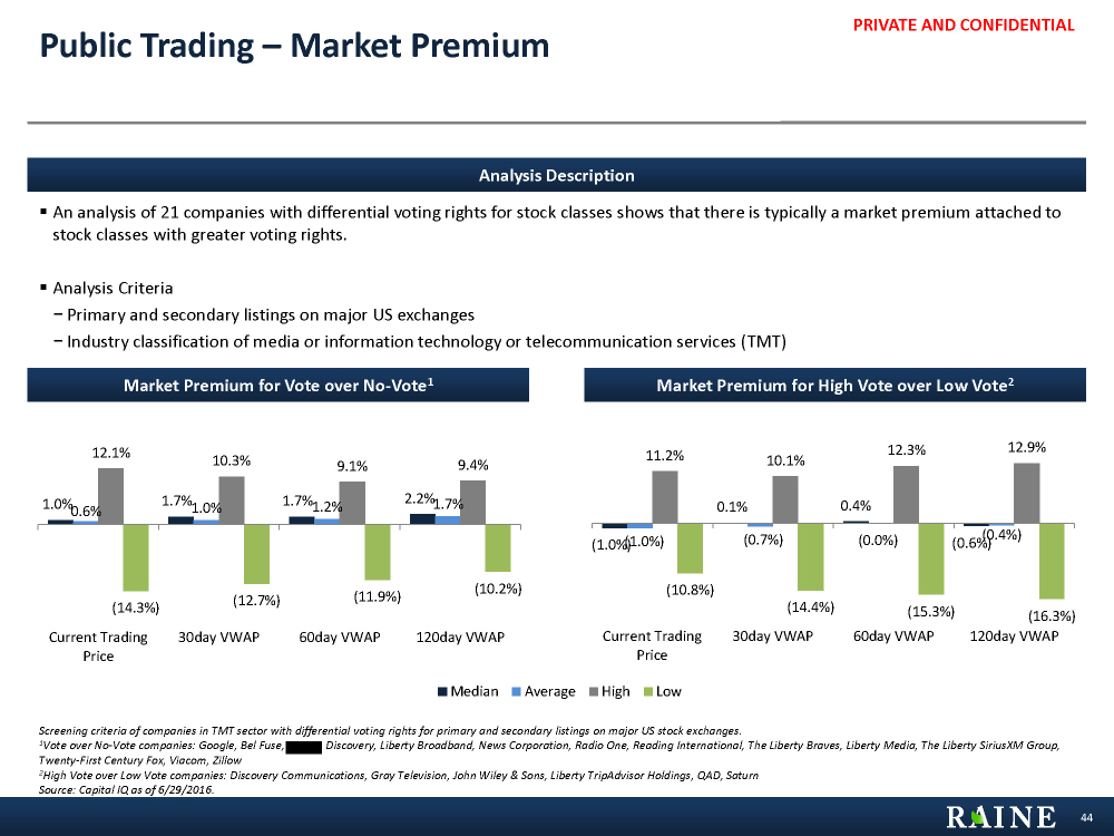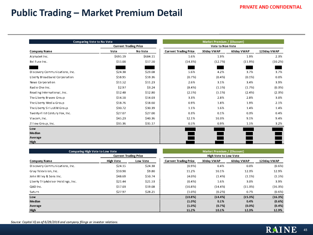 PRIVATE AND CONFIDENTIAL (1.0%) 0.1% 0.4% (0.6%) (1.0%) (0.7%) (0.0%) (0.4%) 11.2% 10.1% 12.3% 12.9% (10.8%) (14.4%) (15.3%) (16.3%) Current Trading Price 30day VWAP 60day VWAP 120day VWAP 1.0% 1.7% 1.7% 2.2% 0.6% 1.0% 1.2% 1.7% 12.1% 10.3% 9.1% 9.4% (14.3%) (12.7%) (11.9%) (10.2%) Current Trading Price 30day VWAP 60day VWAP 120day VWAP Market Premium for Vote over No-Vote1 Market Premium for High Vote over Low Vote2 44 Public Trading – Market Premium Screening criteria of companies in TMT sector with differential voting rights for primary and secondary listings on major US stock exchanges. 1Vote over No-Vote companies: Google, Bel Fuse, Discovery, Liberty Broadband, News Corporation, Radio One, Reading International, The Liberty Braves, Liberty Media, The Liberty SiriusXM Group, Twenty-First Century Fox, Viacom, Zillow 2High Vote over Low Vote companies: Discovery Communications, Gray Television, John Wiley & Sons, Liberty TripAdvisor Holdings, QAD, Saturn Source: Capital IQ as of 6/29/2016. Analysis Description § An analysis of 21 companies with differential voting rights for stock classes shows that there is typically a market premium attached to stock classes with greater voting rights. § Analysis Criteria − Primary and secondary listings on major US exchanges − Industry classification of media or information technology or telecommunication services (TMT) 1.9% 2.2% 2.9% 2.9% 1.5% 1.7% 2.1% 2.2% 10.0% 8.6% 8.0% 9.4% (12.6%) (12.7%) (10.2%) (9.9%) Today Closing 30day VWAP 60day VWAP 120day VWAP Median Average High Low