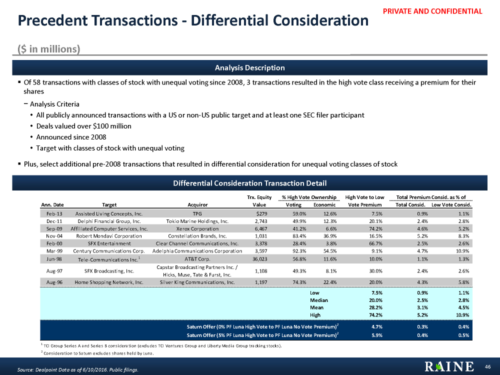 PRIVATE AND CONFIDENTIAL Public Trading – Market Premium Detail Source: Capital IQ as of 6/29/2016 and company filings or investor relations. 45 Comparing Vote to No Vote Market Premium / (Discount) Current Trading Price Vote to Non Vote Company Name Vote No Vote Current Trading Price 30day VWAP 60day VWAP 120day VWAP Alphabet Inc. $695.19 $684.11 1.6% 1.9% 1.9% 2.3% Bel Fuse Inc. $15.00 $17.50 (14.3%) (12.7%) (11.9%) (10.2%) Discovery Communications, Inc. $24.38 $23.08 5.6% 4.2% 3.7% 3.7% Liberty Broadband Corporation $58.95 $59.36 (0.7%) (0.4%) (0.1%) 0.0% News Corporation $11.52 $11.23 2.6% 3.1% 3.4% 3.9% Radio One Inc. $2.97 $3.24 (8.4%) (1.5%) (1.7%) (0.3%) Reading International, Inc. $12.48 $12.80 (2.5%) (5.1%) (2.4%) (2.3%) The Liberty Braves Group $14.50 $14.03 3.3% 2.8% 2.8% 3.0% The Liberty Media Group $18.76 $18.60 0.9% 1.8% 1.9% 2.1% The Liberty SiriusXM Group $30.72 $30.39 1.1% 1.6% 1.4% 1.4% Twenty-First Century Fox, Inc. $27.07 $27.00 0.3% 0.1% 0.3% 0.4% Viacom, Inc. $45.23 $40.36 12.1% 10.3% 9.1% 9.4% Zillow Group, Inc. $35.36 $35.17 0.5% 0.9% 1.5% 3.2% Low Median Average High Comparing High Vote to Low Vote Market Premium / (Discount) Current Trading Price High Vote to Low Vote Company Name High Vote Low Vote Current Trading Price 30day VWAP 60day VWAP 120day VWAP Discovery Communications, Inc. $24.15 $24.38 (0.9%) 0.4% 0.0% (0.6%) Gray Television, Inc. $10.90 $9.80 11.2% 10.1% 12.3% 12.9% John Wiley & Sons Inc. $48.69 $50.74 (4.0%) (1.4%) (1.1%) (1.5%) Liberty TripAdvisor Holdings, Inc. $21.44 $21.53 (0.4%) 1.6% 3.0% 3.9% QAD Inc. $17.03 $19.08 (10.8%) (14.4%) (15.3%) (16.3%) Saturn $27.97 $28.25 (1.0%) (0.2%) 0.7% (0.6%) Low (10.8%) (14.4%) (15.3%) (16.3%) Median (1.0%) 0.1% 0.4% (0.6%) Average (1.0%) (0.7%) (0.0%) (0.4%) High 11.2% 10.1% 12.3% 12.9%