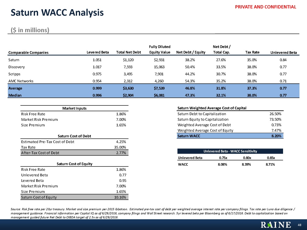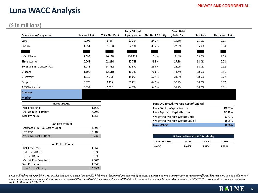 PRIVATE AND CONFIDENTIAL Market Inputs Risk Free Rate 1.86% Market Risk Premium 7.00% Size Premium 1.65% Saturn Cost of Debt Estimated Pre-Tax Cost of Debt 4.25% Tax Rate 35.00% After-Tax Cost of Debt 2.77% Saturn Cost of Equity Risk Free Rate 1.86% Unlevered Beta 0.77 Levered Beta 0.95 Market Risk Premium 7.00% Size Premium 1.65% Saturn Cost of Equity 10.16% Saturn Weighted Average Cost of Capital Saturn Debt to Capitalization 26.50% Saturn Equity to Capitalization 73.50% Weighted Average Cost of Debt 0.73% Weighted Average Cost of Equity 7.47% Saturn WACC 8.20% Comparable Companies Levered Beta Total Net Debt Fully Diluted Equity Value Net Debt / Equity Net Debt / Total Cap. Tax Rate Unlevered Beta Saturn 1.051 $1,120 $2,931 38.2% 27.6% 35.0% 0.84 Discovery 1.017 7,593 15,063 50.4% 33.5% 38.0% 0.77 Scripps 0.975 3,495 7,901 44.2% 30.7% 38.0% 0.77 AMC Networks 0.954 2,312 4,260 54.3% 35.2% 38.0% 0.71 Average 0.999 $3,630 $7,539 46.8% 31.8% 37.3% 0.77 Median 0.996 $2,904 $6,081 47.3% 32.1% 38.0% 0.77 Saturn WACC Analysis ($ in millions) Source: Risk free rate per 20yr treasury. Market and size premium per 2015 Ibbotson. Estimated pre-tax cost of debt per weighted average interest rate per company filings. Tax rate per Luna due diligence / management guidance. Financial information per Capital IQ as of 6/29/2016, company filings and Wall Street research. 5yr levered beta per Bloomberg as of 6/17/2016. Debt to capitalization based on management guided future Net Debt to OIBDA target of 2.5x as of 6/29/2016. 48 Unlevered Beta - WACC Sensitivity Unlevered Beta 0.75x 0.80x 0.85x WACC 8.08% 8.39% 8.71%