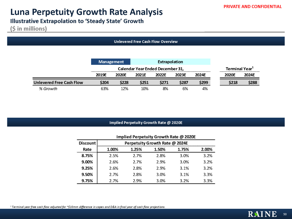 PRIVATE AND CONFIDENTIAL Luna Perpetuity Growth Rate Analysis Illustrative Extrapolation to ‘Steady State’ Growth ($ in millions) 50 Unlevered Free Cash Flow Overview Management Extrapolation Calendar Year Ended December 31, Terminal Year1 2019E 2020E 2021E 2022E 2023E 2024E 2020E 2024E Unlevered Free Cash Flow $204 $228 $251 $271 $287 $299 $218 $288 % Growth 63% 12% 10% 8% 6% 4% 1 Terminal year free cash flow adjusted for ~$10mm difference in capex and D&A in final year of cash flow projections. Implied Perpetuity Growth Rate @ 2020E Implied Perpetuity Growth Rate @ 2020E Discount Perpetuity Growth Rate @ 2024E Rate 1.00% 1.25% 1.50% 1.75% 2.00% 8.75% 2.5% 2.7% 2.8% 3.0% 3.2% 9.00% 2.6% 2.7% 2.9% 3.0% 3.2% 9.25% 2.6% 2.8% 2.9% 3.1% 3.2% 9.50% 2.7% 2.8% 3.0% 3.1% 3.3% 9.75% 2.7% 2.9% 3.0% 3.2% 3.3%
