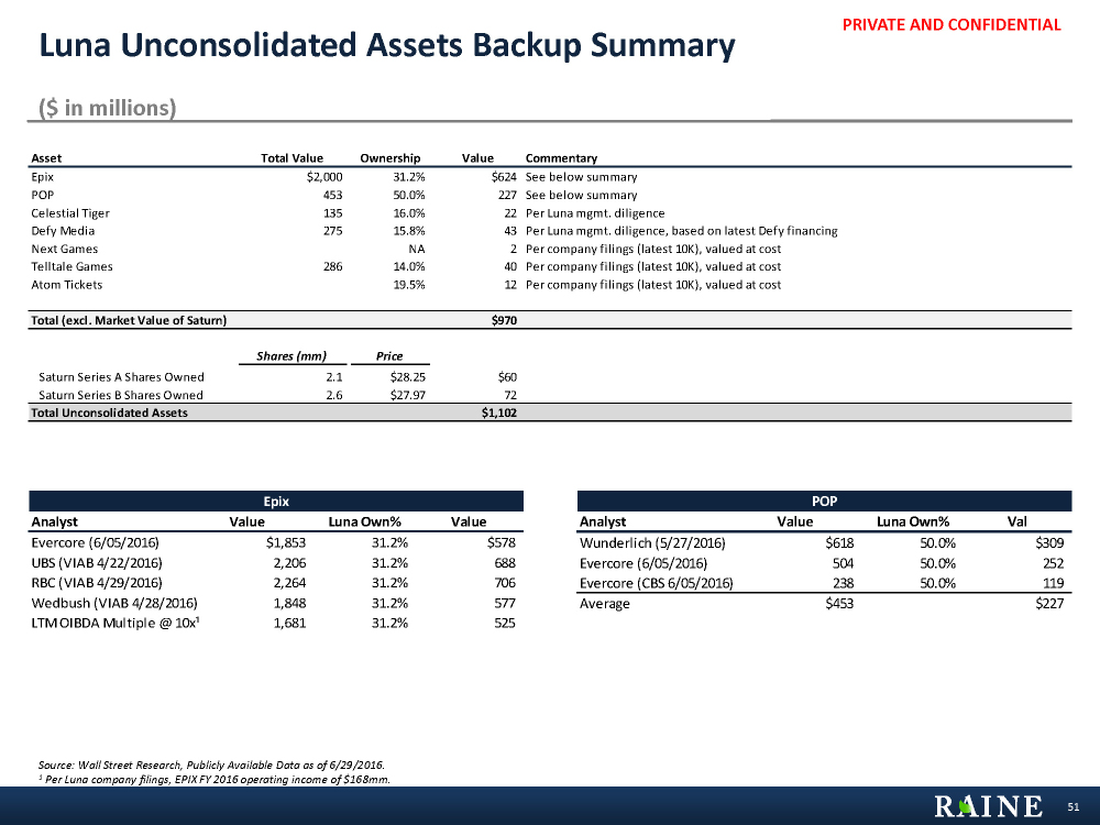 PRIVATE AND CONFIDENTIAL Luna Unconsolidated Assets Backup Summary ($ in millions) Source: Wall Street Research, Publicly Available Data as of 6/29/2016. 1 Per Luna company filings, EPIX FY 2016 operating income of $168mm. 51 POP Analyst Value Luna Own% Val Wunderlich (5/27/2016) $618 50.0% $309 Evercore (6/05/2016) 504 50.0% 252 Evercore (CBS 6/05/2016) 238 50.0% 119 Average $453 $227 Asset Total Value Ownership Value Commentary Epix $2,000 31.2% $624 See below summary POP 453 50.0% 227 See below summary Celestial Tiger 135 16.0% 22 Per Luna mgmt. diligence Defy Media 275 15.8% 43 Per Luna mgmt. diligence, based on latest Defy financing Next Games NA 2 Per company filings (latest 10K), valued at cost Telltale Games 286 14.0% 40 Per company filings (latest 10K), valued at cost Atom Tickets 19.5% 12 Per company filings (latest 10K), valued at cost Total (excl. Market Value of Saturn) $970 Shares (mm) Price Saturn Series A Shares Owned 2.1 $28.25 $60 Saturn Series B Shares Owned 2.6 $27.97 72 Total Unconsolidated Assets $1,102 Epix Analyst Value Luna Own% Value Evercore (6/05/2016) $1,853 31.2% $578 UBS (VIAB 4/22/2016) 2,206 31.2% 688 RBC (VIAB 4/29/2016) 2,264 31.2% 706 Wedbush (VIAB 4/28/2016) 1,848 31.2% 577 LTM OIBDA Multiple @ 10x¹ 1,681 31.2% 525