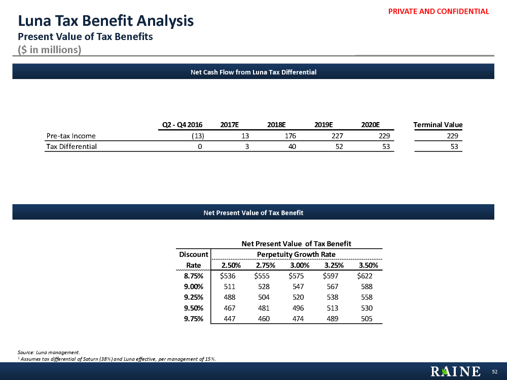 PRIVATE AND CONFIDENTIAL Net Present Value of Tax Benefit Discount Perpetuity Growth Rate Rate 2.50% 2.75% 3.00% 3.25% 3.50% 8.75% $536 $555 $575 $597 $622 9.00% 511 528 547 567 588 9.25% 488 504 520 538 558 9.50% 467 481 496 513 530 9.75% 447 460 474 489 505 Luna Tax Benefit Analysis Present Value of Tax Benefits ($ in millions) 52 Net Cash Flow from Luna Tax Differential Source: Luna management. 1 Assumes tax differential of Saturn (38%) and Luna effective, per management of 15%. Net Present Value of Tax Benefit Q2 - Q4 2016 2017E 2018E 2019E 2020E Terminal Value Pre-tax Income (13) 13 176 227 229 229 Tax Differential 0 3 40 52 53 53