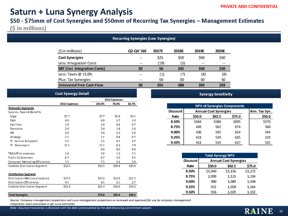PRIVATE AND CONFIDENTIAL ($ in millions) Q2-Q4 '16E 2017E 2018E 2019E 2020E Cost Synergies -- $25 $50 $50 $50 Less: Integration Costs -- (19) (5) -- -- EBT (incl. Integration Costs) $0 $6 $45 $50 $50 Less: Taxes @ 15.0% -- (1) (7) (8) (8) Plus: Tax Synergies -- 50 50 50 50 Unlevered Free Cash Flow $0 $55 $88 $93 $93 2016 Expenses 2016 Expenses 100.0% 75.0% 66.7% Networks Segments Salaries, Taxes & Benefits Legal $7.7 $7.7 $5.8 $5.1 F&A 4.9 4.9 3.7 3.3 Facilities 1.0 1.0 0.8 0.7 Executive 2.4 2.4 1.8 1.6 HR 3.0 3.0 2.3 2.0 Strategy 1.1 1.1 0.8 0.7 IT - Service & Support 5.5 5.5 4.1 3.7 IT - Developers 11.1 11.1 8.3 7.4 0.0 0.0 0.0 T&E/office expenses 1.6 1.6 1.2 1.1 Public Co Expenses 6.7 6.7 5.0 4.5 Consumer Marketing Efficiencies 7.5 7.5 5.6 5.0 Subtotal Distribution Segment $52.5 $52.5 $39.4 $35.0 Distribution Segment Distribution G&A (no allocation) $17.2 $17.2 $12.9 $11.5 Distribution Efficiencies 4.1 4.1 3.1 2.7 Subtotal Distribution Segment $21.3 $21.3 $16.0 $14.2 Total Synergies $73.8 $55.4 $49.2 Recurring Synergies (Low Synergies) Cost Synergy Detail Synergy Sensitivity 54 Saturn + Luna Synergy Analysis ($ in millions) $50 - $75mm of Cost Synergies and $50mm of Recurring Tax Synergies – Management Estimates Source: Company management projections and Luna management projections as reviewed and approved for use by company management. Integration costs and phase-in per Luna estimates. Note: Assumes transaction is financed with the debt contemplated by the debt financing commitment papers. NPV of Synergies Components Discount Annual Cost Synergies Ann. Tax Syn. Rate $50.0 $62.5 $75.0 $50.0 8.50% $464 $580 $695 $576 8.75% 449 562 674 560 9.00% 436 545 654 544 9.25% 423 529 635 529 9.50% 411 514 617 515 Total Synergy NPV Discount Annual Cost Synergies Rate $50.0 $62.5 $75.0 8.50% $1,040 $1,156 $1,272 8.75% 1,009 1,121 1,234 9.00% 980 1,089 1,198 9.25% 952 1,058 1,164 9.50% 926 1,029 1,132